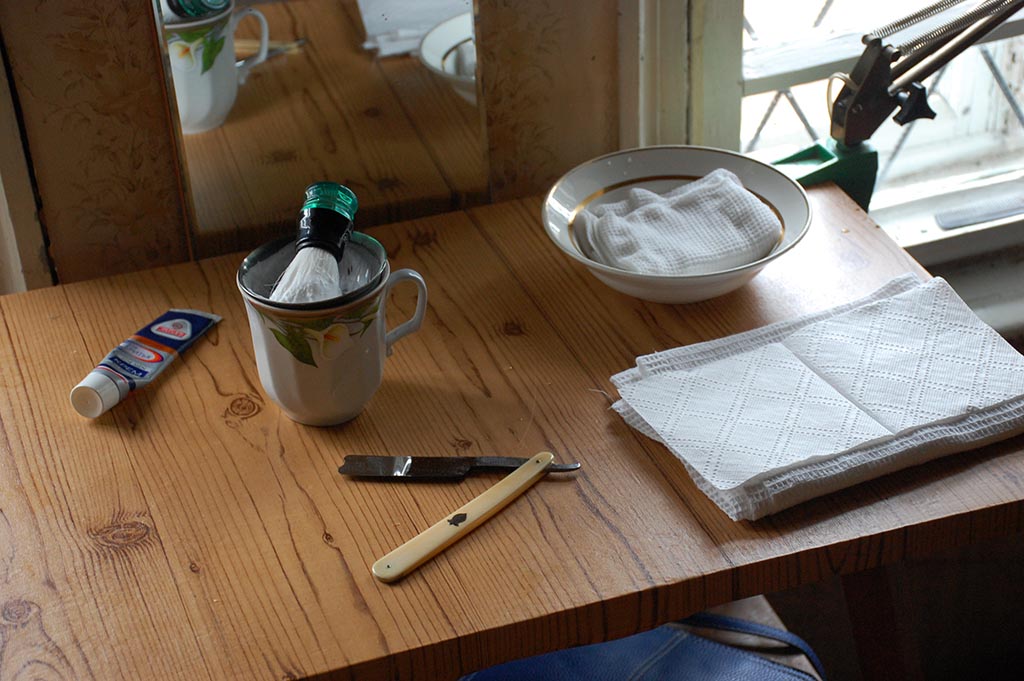 Бритва - John Bagshaw Ремень для правки бритвы - синтетический от Кая Как бы скаттл - комбинация кокотницы с отломанной ручкой и кружки Крем для бритья "Знахарь" Помазок - Omega синтетика Гель после бритья "Комильфо". Предпочтения отданы консервированным и синтетическим средствам для бритья для удобства транспортировки и обслуживания. Зеркало старое, от трельяжа Вафельные полотенца, салфетка, тарелка, журнальный столик. Spoiler Show