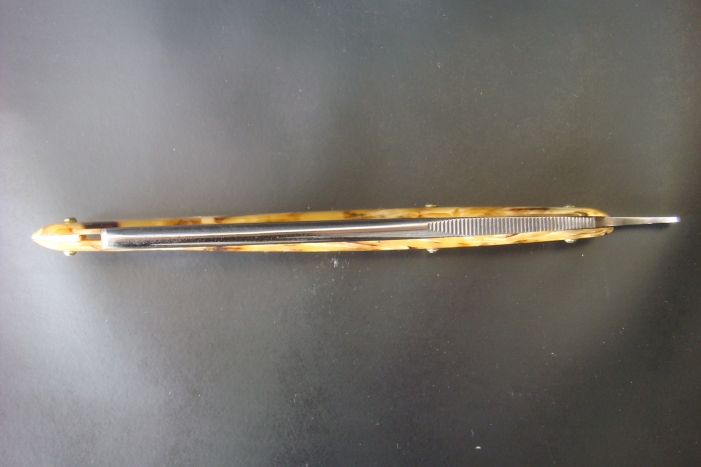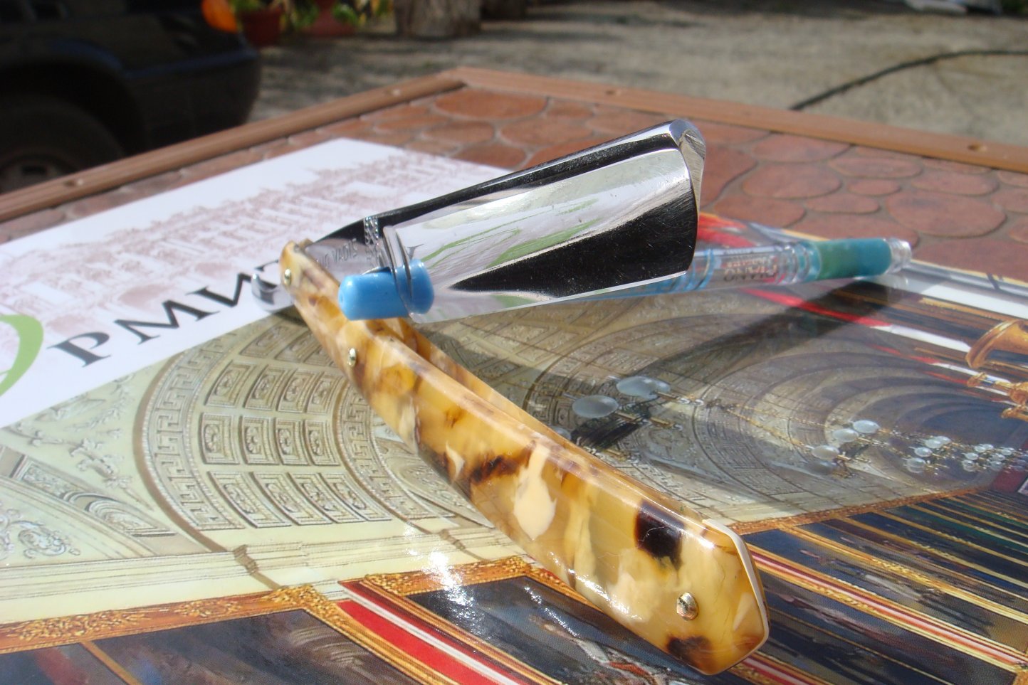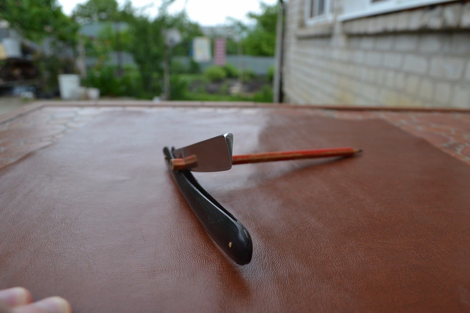 Лезвие приклеено к "спинке" клеем Poxipol. Заточена, готова к бритью. Продана.