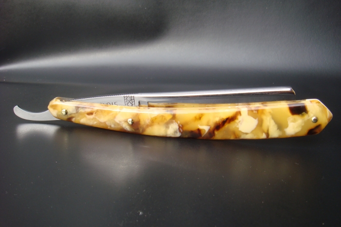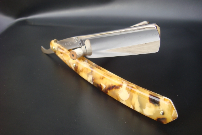Форма лезвия Near Wedge (почти клин). Ширина 5/8. Ручка Рог. Пины Латунь. Заточена, готова к бритью. Продана.. Wade and Butcher Show