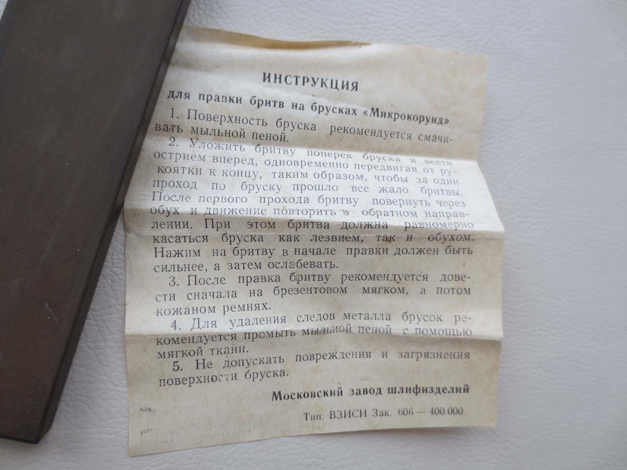 Непользованная "Экстра" 58 со следами заводского масла, камешек "Микрокорунд" и новый помазок... Красота! Помазок очень понравился - ФТЩ им. Калинина. Думаю, что это аббревиатура от Фабрика Технической Щетины, а там кто её знает. В инете нашёл только - Кистевязальная щеточная фабрика им Калинина Деткомиссии при ВЦИК Москва Таганская 36.Ну и название... Помазок поначалу был снулый( на первом фото), в кипяток его , потом шампунь и он приобрёл первоначальную форму. Легкий запах карболита, как от "лампы НКВД". Вылетело пару волосков, когда мыл, остальное дёргал - сидит крепко. Больше полувека помазку, натурпродукт из прошлого, будем тестировать.. Брусок "Микрокорунд" Инструкция к нему..) Бесит, когда приходится пользоваться бритвой моложе себя...