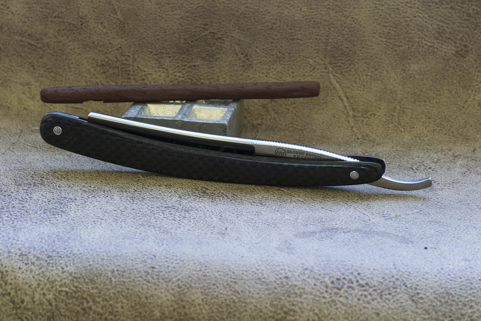Старая английская бритва, конца 19 - начала 20 века. Ширина 5/8, полная вогнутость, новая рукоять из карбона. На полотне есть небольшие следы времени. Так же есть пара небольших пятнышек на рисунке Карбон в районе нижнего пина (видно на фото) Клинышек из олова. Бритва от достаточно известного производителя из Шеффилда, с самобытным травлением в виде бюстика Шекспира на полотне и двумя надписями "Keen on this razors edge are invisible" что в вольном переводе означает "Острие этих бритв невидимо или Бритвы с невидимым острием.." И действительно фаска от заточки очень тонкая и равномерная, что говорит о хорошей геометрии. Вторая надпись дает отсылку к одному из произведений Шекспира "Shakespeare. Loves Labor Lost" - Бесплодные усилия любви. Бритва заточена и готова к бритью, закрывется идеально по центру рукояти. Годится как для новичка, так и в коллекцию, носик слегка скруглен во избежание порезов. Продано. Spoiler Show