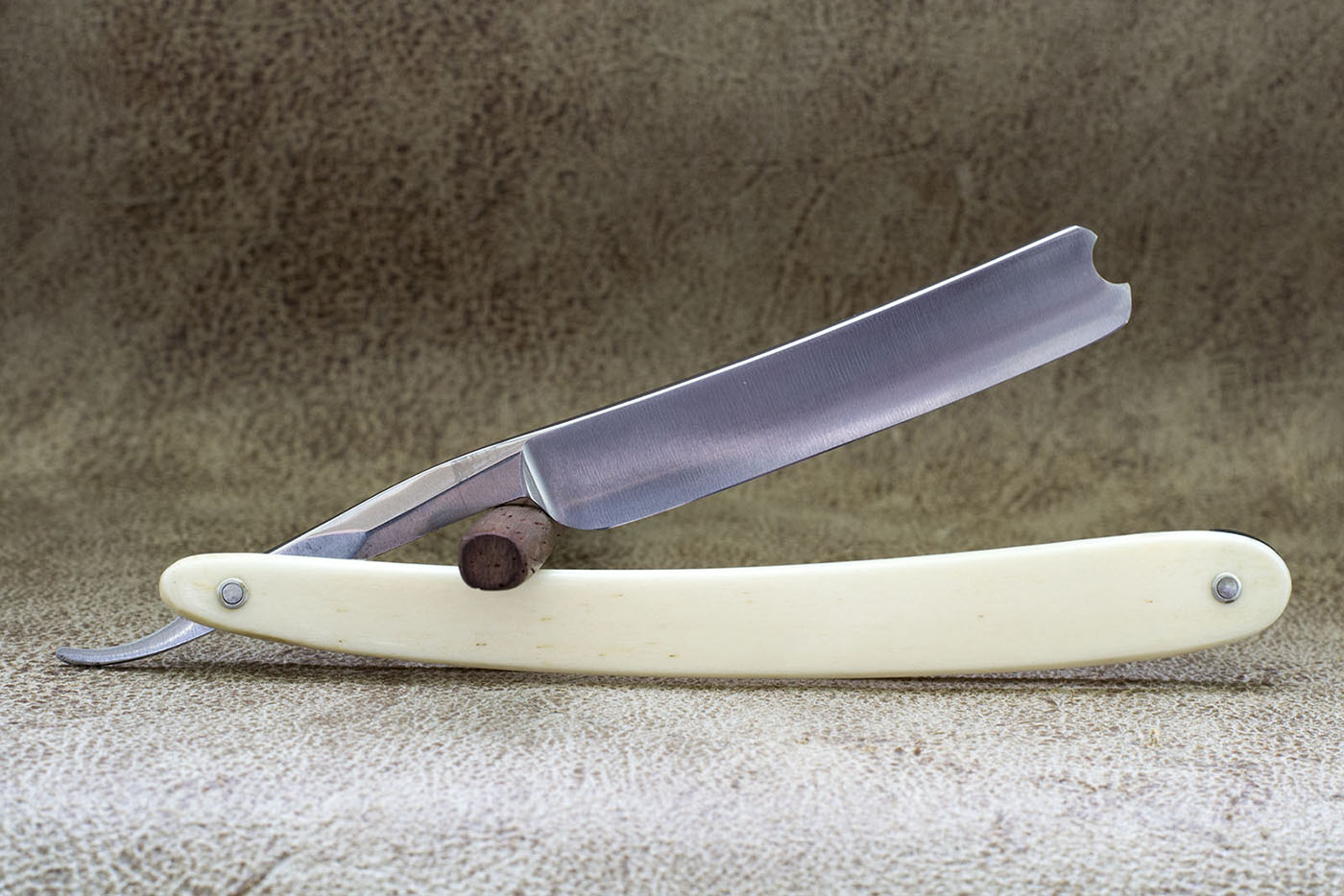 Английская опасная бритва середины 19 века. Массивный армейский клин в прекрасном сохране. Ширина 21 мм. Родная роговая рукоять, родные шайбы. На лицевой стороне рукояти имеются неглубокие рельефные трещинки, что сперва было принято мной за недостаток, тем не менее рог все еще прочный, не деформированный и не сухой. А трещинки придают некий антикварный вид бритве. Геометрия у полотна идеальная, фаска тонкая и равномерная, сталь великолепна. Бритва заточена и готова к бритью. Продано Spoiler Show