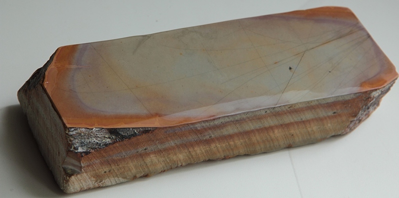 Очень красивый оттенок рабочей поверхности.На сухую, камень имеет приятный цвет Асаги, с едва уловимыми фиолетовыми кольцами по краям и коричневой окантовкой(типа Киита). При работе с водой, камень открывает ещё и зеленоватый оттенок и заметным проявлением фиолетового по краям.