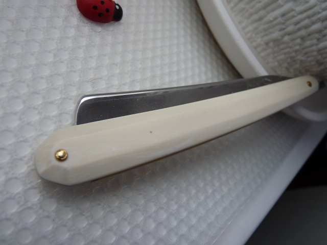 Re: Ручка (оправа) бритвы - изготовление/ремонтВот ещё примерчик использования/сочетания современных материалов ручки, правда для старого француза. Но это Элфорин - современный заменитель/имитатор слоновой кости, сейчас идет на бильярдные шары и накладки клавиш для фоно.