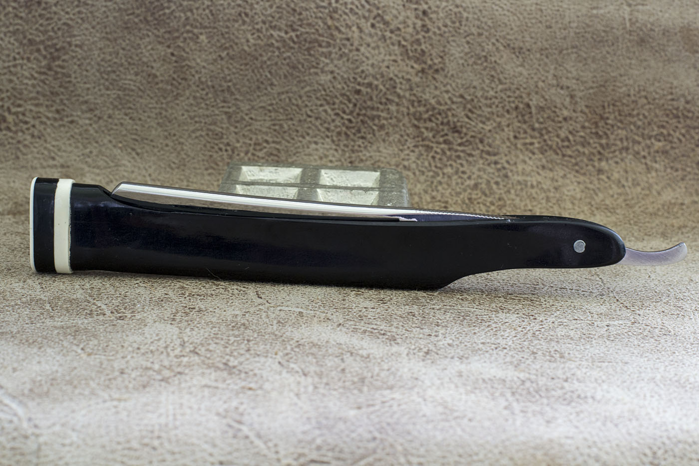 Английская опасная бритва середины 19 века. Массивный армейский клин в прекрасном сохране. Ширина 21 мм. Родная роговая рукоять, родные шайбы. На лицевой стороне рукояти имеются неглубокие рельефные трещинки, что сперва было принято мной за недостаток, тем не менее рог все еще прочный, не деформированный и не сухой. А трещинки придают некий антикварный вид бритве. Геометрия у полотна идеальная, фаска тонкая и равномерная, сталь великолепна. Бритва заточена и готова к бритью. Продано Spoiler Show