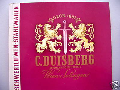 https://www.duisberg.at/erp/webshop/inf ... 1026D486BC" onclick="window.open(this.href);return false; https://www.duisberg.at/" onclick="window.open(this.href);return false; В талмудах есть ишшо чё поковырять... Будет время - выложу. Плюс приоткрылась тайна кому теперь принадлежат Pfeilring и Felix вот уж никак не думал что им... Хотя... вроде теперь это просто оптовая контора, чё это они их знаки у себя на сайте выложили? Вроде как теперь тут: C. Duisberg Schwertloewen GmbH & Co. Aufderhöher Str. 108 42699 Solingen Nordrhein-Westfalen Telefon: +49 212 232130 Telefax: +49 212 336006 В 1999 была тут: Bäckershof 19 Solingen На e-Bay можно книгу о них купить 1965 года: http://cgi.ebay.at/C-Duisberg-1965-Wien ... RCH:AT:101" onclick="window.open(this.href);return false; Ремонт опасных бритв, звонить с 11-00 до 23-00, +79267729357, (whats app, telegram, VK), спросить Олега.