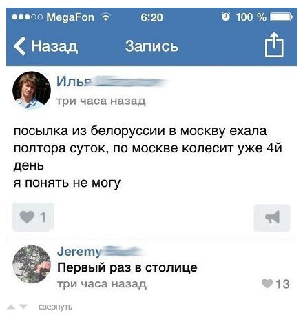 Добавлено спустя 6 минут 19 секунд: Но в отделении лежит неделю! Пока сам не придешь и не спросишь: "а не соизволите ли взглянуть, мож какая оказия что нибудь привезла?" - Оба-на! Точно есть! - А чего ж не звоните, не пишете? - Да, как то недосуг. Бля, это почти дословный диалог!