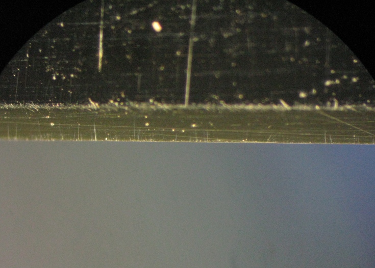 Re: Продаётся от Sandr (бритвы, РЕМНИ, аксессуары)Поступил запрос на фото фасок. ХЗ для чего это нужно, вам всё равно не точить, говорят для эстетики. Ну оценивайте тогда. На фасках трудно сфокусироваться, так что фото как есть, надеюсь видно что нужно было. Заодно сделаю фото кромки, так-то хорошо бы сразу к бритве её прикладывать, но финиш может быть изменен по желанию заказчика, так что сразу не делал.