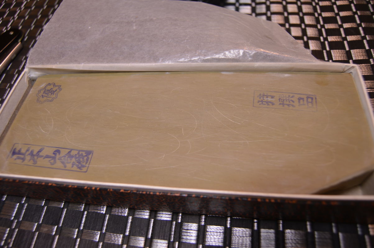 Re: Продаётся от artemarut1Spoiler Show Японский финишный камень, асаги с желтыми кольцами (кан) и микро черными точками типа нашиджи, на лицевой стороне два штампа, один виден едва, второй просматривается полностью, есть пара штампов с торцов. Твердость у камня 5+ , суспензии своей не дает, можно сказать вечный. На фото и видео состояние камня на данный момент. Размер 150/87/24мм в максимальных измерениях. В общем могу сказать "отборный финишный камень для бритв без каких либо включений и трещин". Цена Продан с доставкой по России.