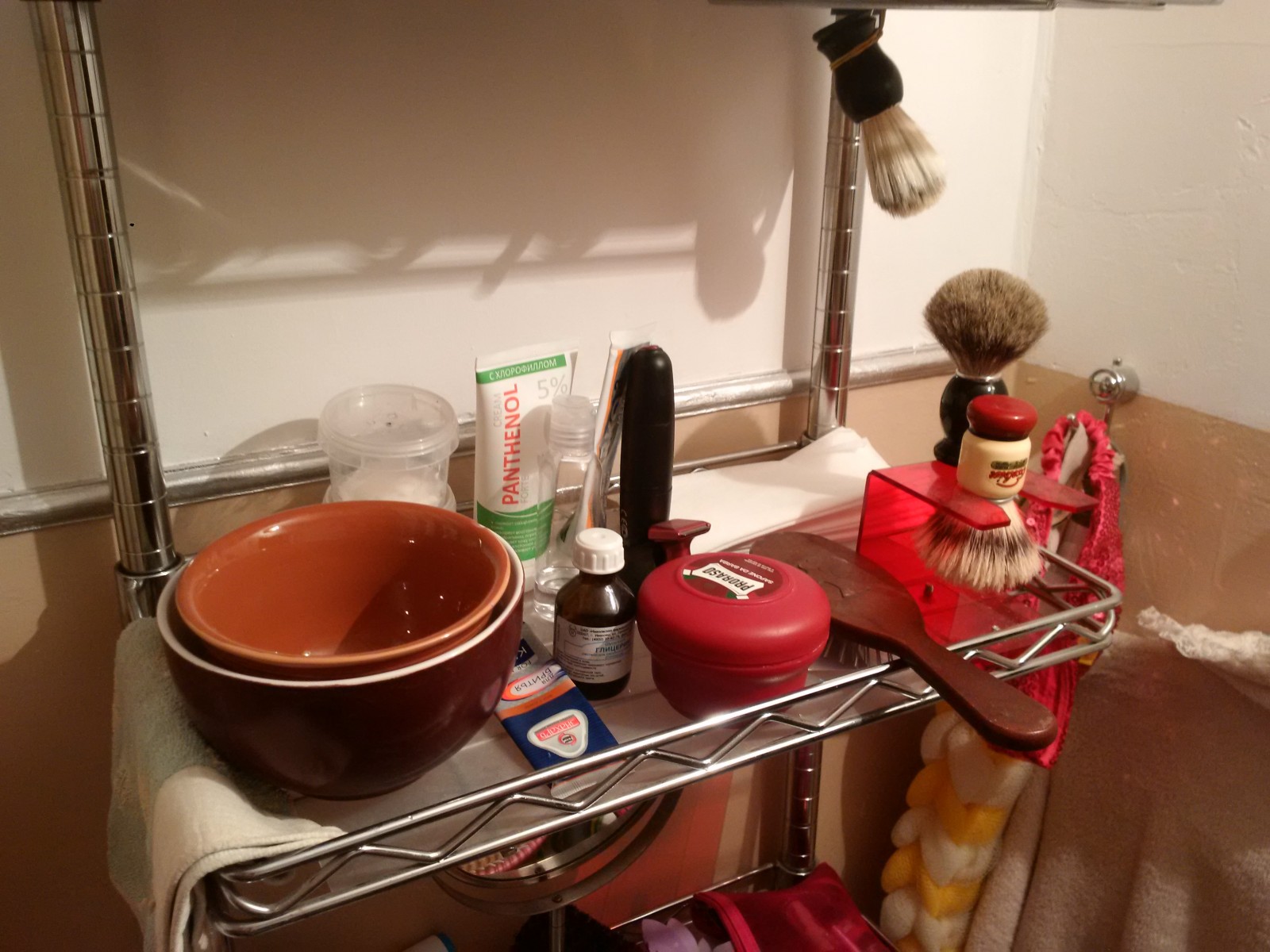 Так и было. Помазок на подставке стоит ванной. А бритвы храню в шкафу в коробочке с силикагелем.