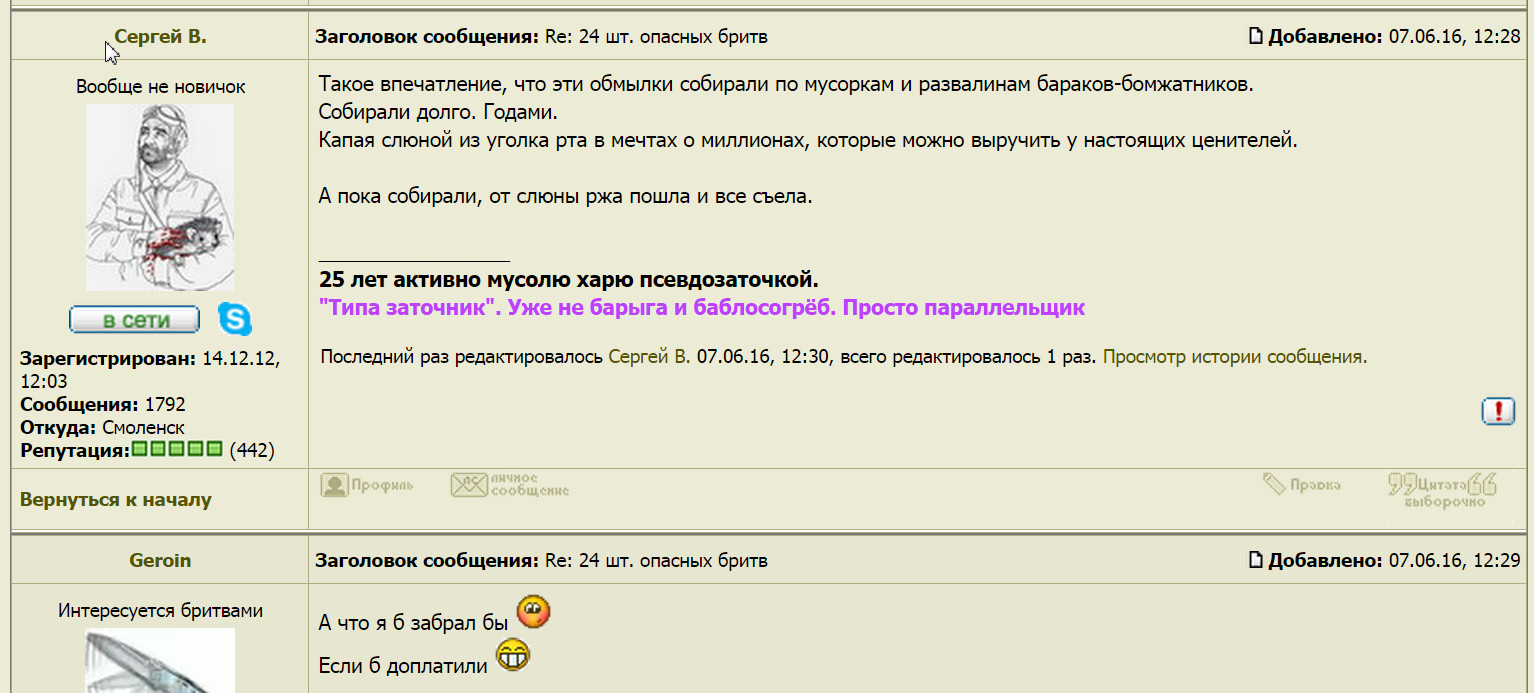 Re: Пара бритв. Помогите опознать.qwerdeather Пальцем ткни, где грубость? Ни одного некультурного слова, все рассказали. А насчет обмылков - тут даже не эксперту видно, что бритвы убитые вусмерть.