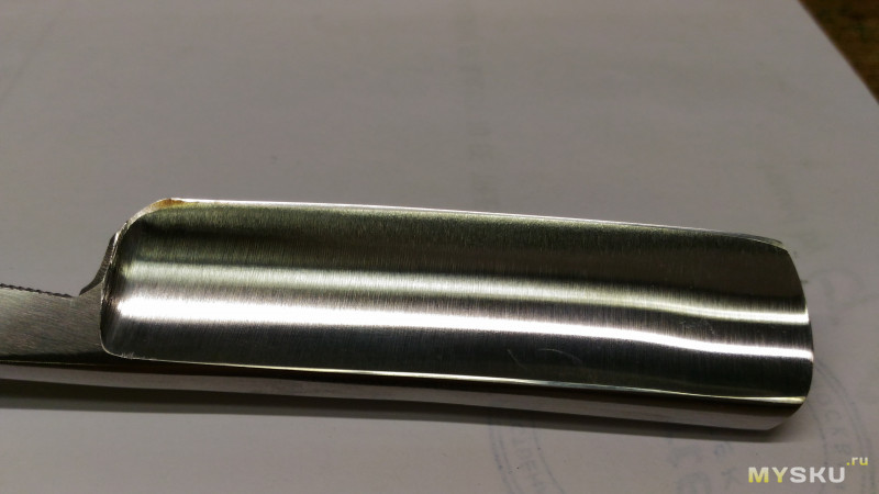 Когда я пытался побриться лезвием "shave ready", у меня свело яйца. И после осмотра лезвия я понял, что точить его бессмысленно: оно отожжено - китайцы, видимо, точат их на абразивном круге и сталь отпущена. Кое-где китаец это замаскировал, но всё равно видно дисколорацию стали.