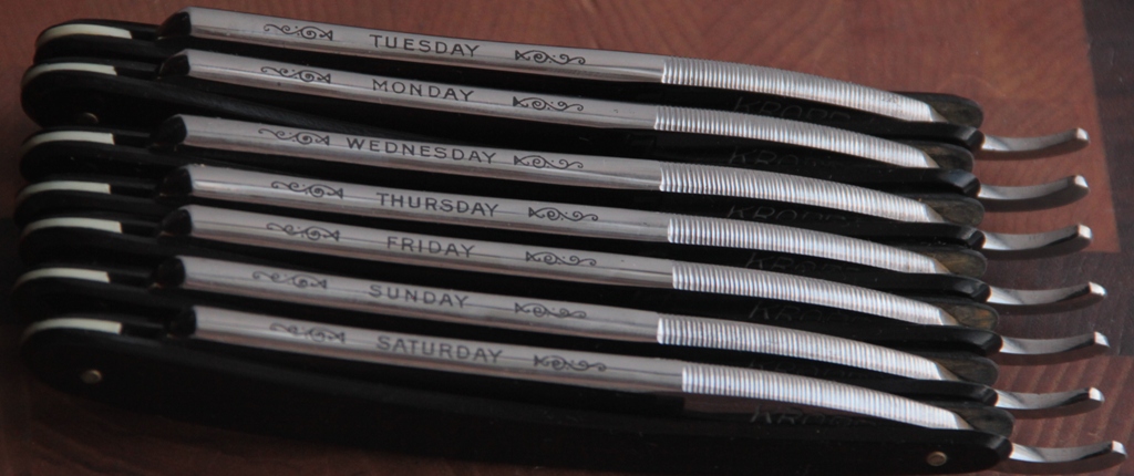 Все 7 бритв из набора совершенно непользованные,как будто только вчера с завода.Бритвы не разбирались и не реставрировались. ПолОтна были в заводской смазке, сейчас имеют заводскую заточку. С коробки очень острые. По всей видимости смазка спасла металл от коррозии и ржавчины. Сталь совершенно не тронута ни патиной, ни ржавчиной. ПолоОтна без царапин или каких либо дефектов. Всё в идеале. Пластиковые ручки находятся также в идеальном состоянии. Бритвы тяжелые. На обушке гравировка дней недели чёткая. Идеальная геометрия изготовления. Кромочка равномерна по всей длине и еле заметна. Такая бритва будет идеальным и достаточно недорогим вариантом для новичка. С бритвами сОвершенно ничего не делал.