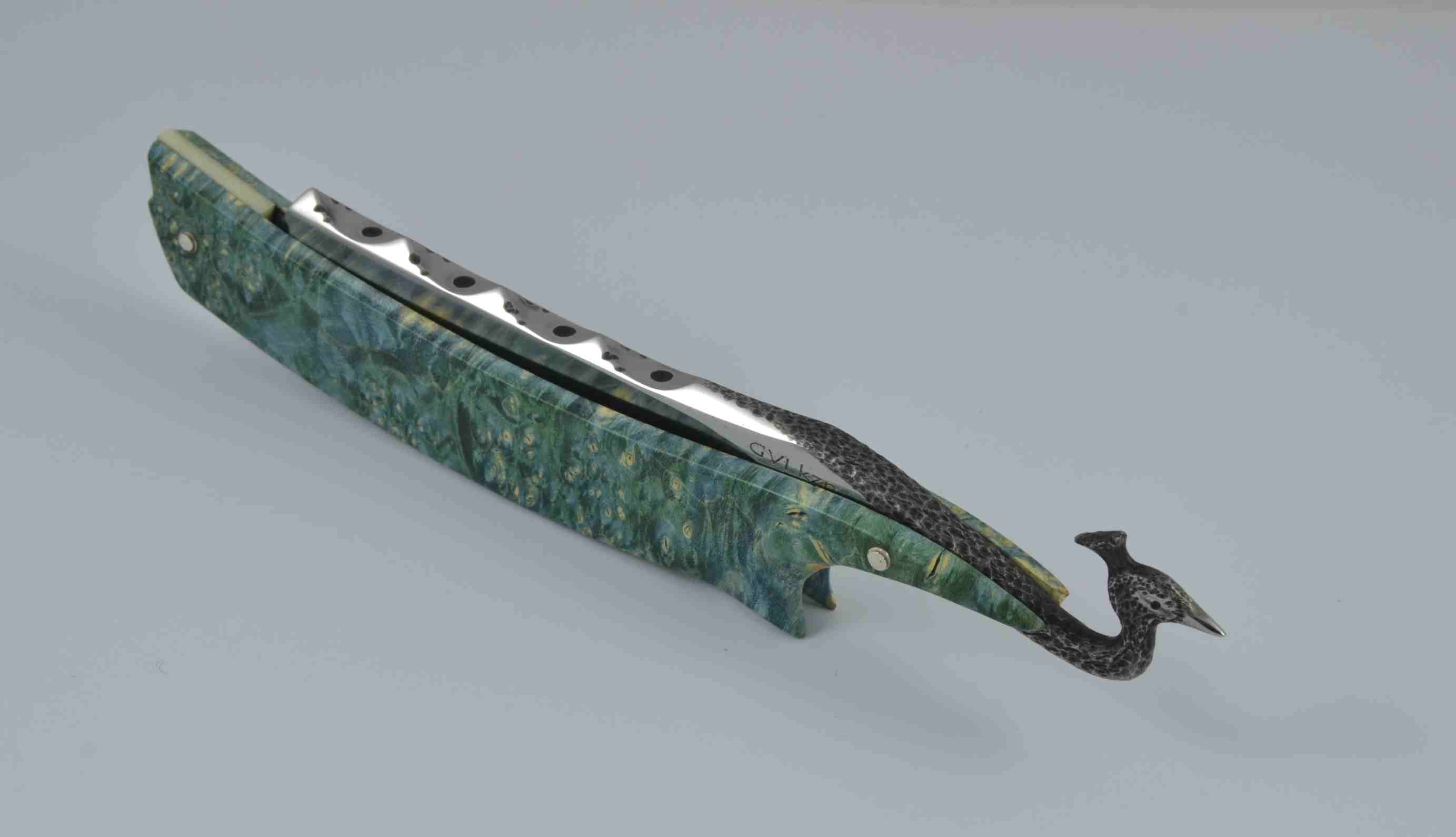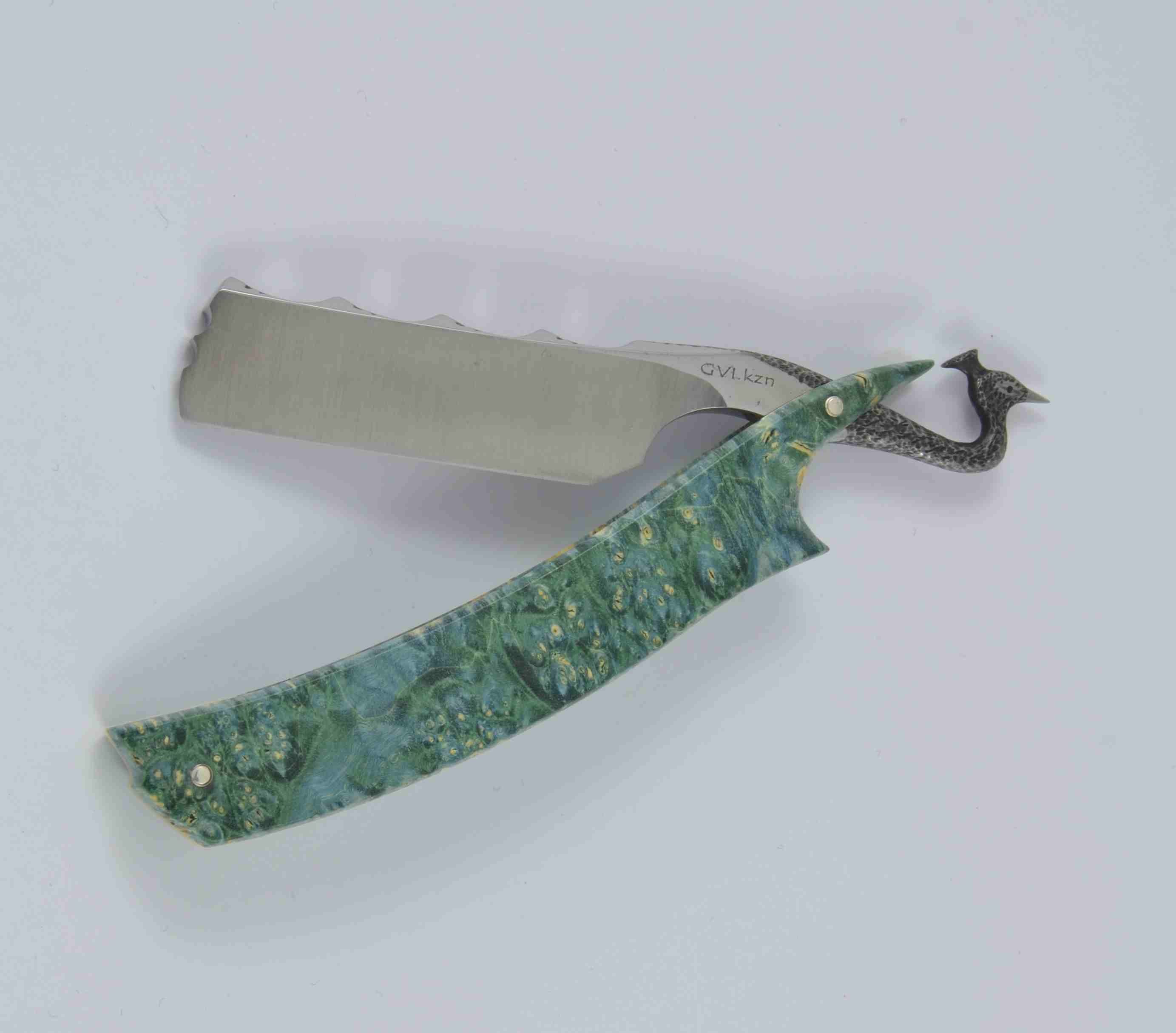 Начну с дамаска. Gergely Horvath делает из такого же дамаска 0801 от Zladinox. Пишет, что отзывы положительные. Мои пока еще в дороге, ими еще кроме меня никто не брился. По моим сведениям Waker тоже работает с этим Дамаском. По поводу форумной бритвы. Я в мае опять уезжаю в поля до ноября, будут только небольшие перерывы. За это время можно определиться с дизайном. Павлин. Форма ручки и хвостовика накладывает некоторые не критичные неудобства. Которые с каждым разом становятся менее заметными. По поводу своих работ. Дизайн иногда предлагают сами заказчики, иногда рисую сам. Люблю четкие незализанные грани переходов плоскостей. Хочу научится полировать лезвие,чтоб как зеркало. Хочу попробовать поработать с другими металлами. Как-то так. Если есть вопросы, пишите, секретов нет. Одним ударом дерева не срубишь. . Татарская поговорка