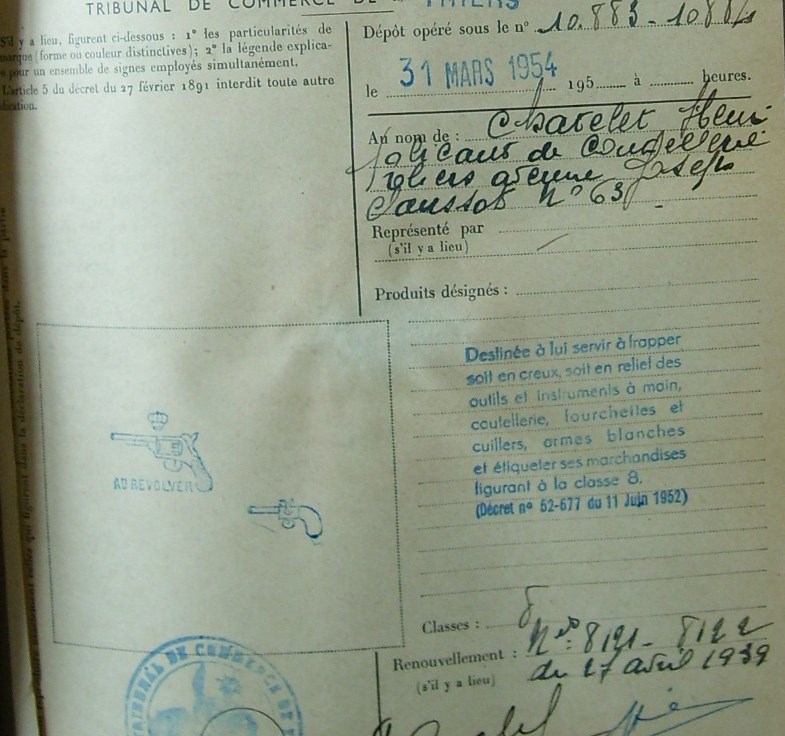 в 1926 году зарегистрирован по адресу: Thiers, 9 rue Mancel Chabot 1937 год, уже "J. Trait & Cie": под названием фирмы написано: usine du May, avenue Joseph-Сlaussat. (фабрика "du May", авеню Joseph-Сlaussat) По этому же адресу, с таким же телефоном 343, но уже в 1954 году указан владелец - Claude Chatelet (Клод Шатле - сын?) Сейчас из этой фабрики сделали музей. Из википедии: Завод был открыт в мае 1895 года ножевой компании Paris Grange Young J. Lepage. Эта компания прекратила торговлю около 1900. Именно с этого периода , площади сдаются в аренду ремесленникам под небольшие мастерские. торговая марка - пистолет с короной, 1954 год: Spoiler Show торговая марка - бюст английского солдата и надпись VERITABLE ANGLAIS торговая марка - 171 INOXYDABLE Spoiler Show Spoiler Show
