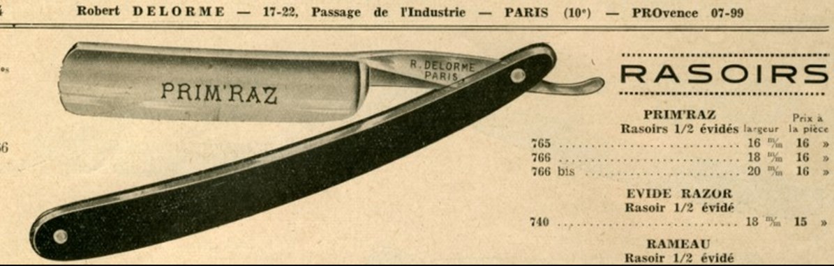 http://www.delorme.fr" onclick="window.open(this.href);return false; - "Всё для профессионалов, парикмахерских и салонов красоты" На сайте о свой истории почти ничего не пишут, только общие фразы: "Мы уже более 100 лет на парикмахерской службе. В то время мы продавали опасные бритвы, маникюрные ножницы, шампуни, мыло, масло для волос и бороды. Клиенты были в основном работники парикмахерских." Сейчас это большая фирма, 500 000 евро уставной капитал, два филиала, занимаются тем же и находятся по тому же адресу. Вот их реклама того времени, 1933 год: Spoiler Show Регистрация торговой марки: Я, нижеподписавшийся, Beaujeu-Dumontel, промышленник и гражданин Тьера, действую от имени Robert Delorme, из Парижа, улица passage de l'Industrie, 22. Beaujeu-Dumontel это владелец большого завода по производству бритв: Всего, по такому поручению, на имя Beaujeu Dumontel было зарегистрировано 14 торговых марок: в 1924 году: THE STARTER, CRISTAL, L'INDUSTRIE ROYALE, Le Petit Parisien, EXTRA DRY, SUPER SALOON, PRIM'RAZ, VICTORY, Tout va bien в 1927 году: PICADOR 80 RO DELORME PARIS - основная марка, которая ставилась на эрле в 1928 году: DIXI, TITUS, CHARLESTON Spoiler Show Но не только Beaujeu Dumontel выпускал для них бритвы. Вот бритва выпущенная фирмой Thiers Issard: Возможно выпускал и кто-то еще. На ранних бритвах ставилось клеймо "R. Delorme Paris" Ну, а сам Robert Delorme (поставщик для парикмахерских), основатель фирмы, умер 6 декабря 1943 года. Вот найденный некролог: