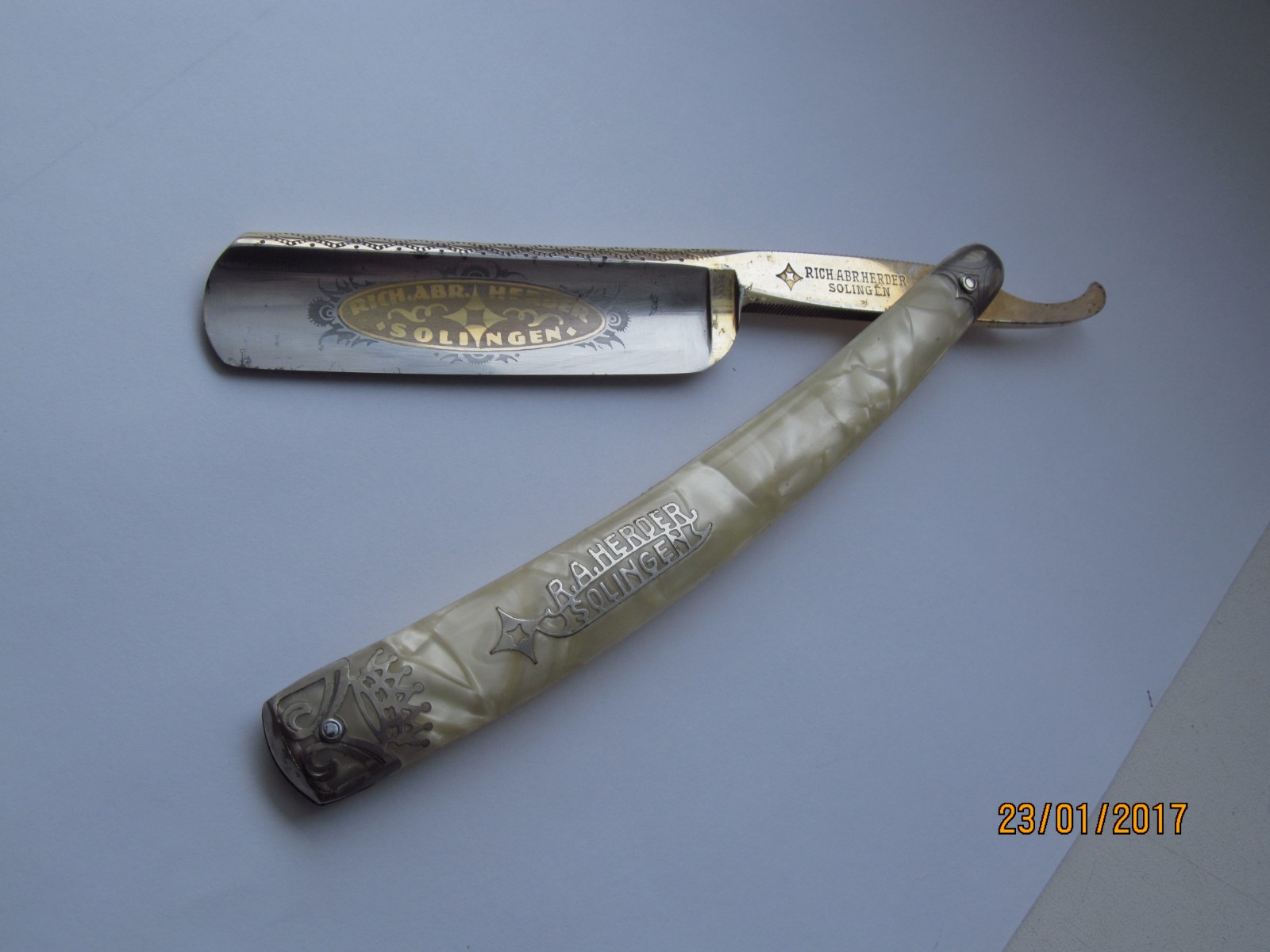 На днях появилась бритва RICH ABR HERDER. SOLINGEN 326. Ее дед привез с войны. По воспоминаниям при покупке у немца в 1945 году, немец говорил, что ей лет 20. Примероно такой же возраст мне подтвердили в мастерской в Москве. Кстати спасибо мастеру, она мне досталась в плохом состоянии (много лет пролежала в шкафу) и мне ее прекрасно восстановили, можно сказать дали вторую жизнь. Ее можно посмотреть и до восстановления и после (в приложении). Сразу прошу прощения за фото, она сделаны на телефон.