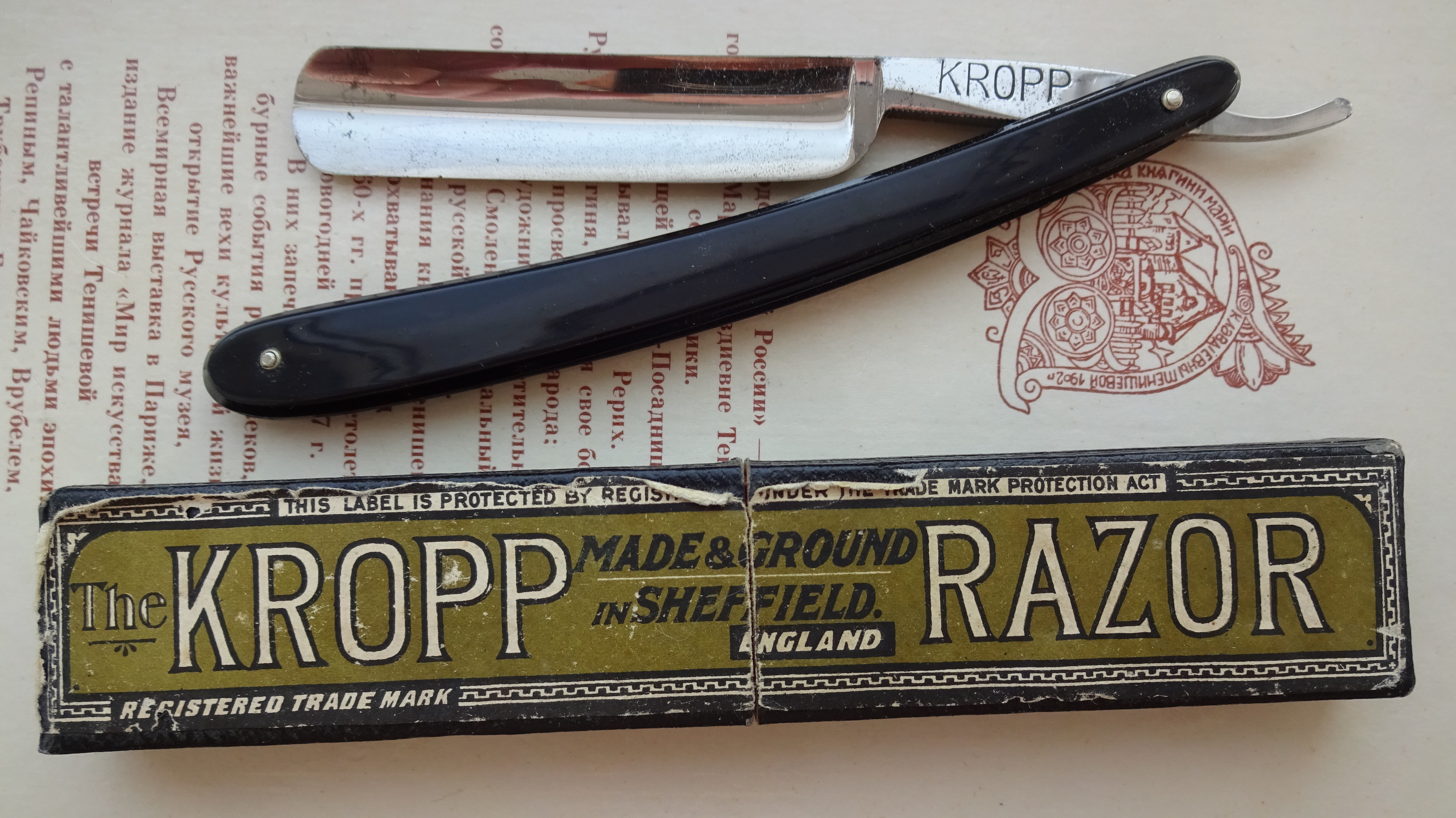 Опасным бритьем занялся недавно. Через месяц пользования китайской дореволюционной "двойной стрелой" 66 захотелось попробовать что-то еще, почувствовать в чем разница между бритвами, ощущениями во время бритья и результатами после. Сначала хотел взять как вторую бритву что-то простое из советского, но решил сразу найти качественную иностранку. Почему-то сложилась склонность к бритвам 6/8 и более дюйма с закругленным к концу клинком. В результате поисков решил остановится на английской бритве. Больше всего понравились KROPP от C. Myers & Son. По найденной информации на различных зарубежных форумах сделал вывод, что они отличаются комфортным и мягким бритьем, да и в целом только положительные отзывы нашел (отзыв Wren в том числе). Удалось найти Kropp в Болгарии по хорошей цене в приличном состоянии, правда с ручкой уз рога, а не с оригинальной. Вот теперь жду посылку, интересно будет ее попробовать. Если есть участники форума, кто пользуется или пользовался бритвами Kropp, буду рад услышать их мнение по поводу бритв и бритья ими. И есть ли у них какие-то отличительные черты от бритв других производителей? Подойдет ли такая бритва новичку или стоило попробовать другую? Joseph Rodgers & Sons 8/8 Barber's Notch, Sheffield