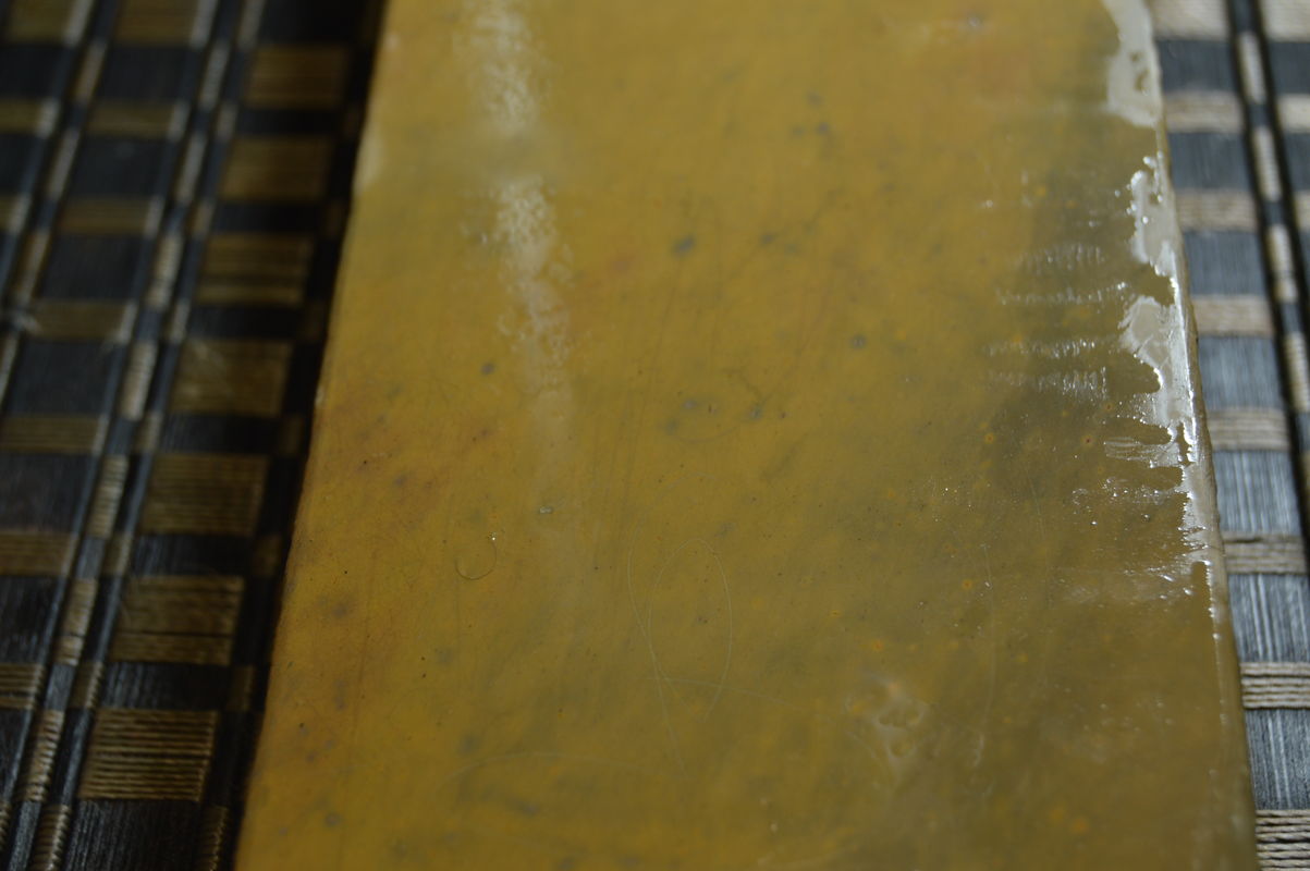 Re: Продаётся от artemarut1 Распродажа страницы №1Spoiler Show Японский камень, цвет солнечный (Иромоно), твердость около 4+ очень тонкий финишный камень, использовать лучше всего последним в сете, суспензию добровольно не дает, но очень легко выжать с помощью нагуры. Такой тип камней можно использовать без сета нагур, достаточно одной более твердой чем сам камень. Нет каких либо царапающих включений, линия на камне исключительно цветовая, обработан против расслаивания (бока и низ, некоторое время камень был в моем рабочем сете). Размер в максимуме 167/83/27мм Цена Продан Spoiler Show