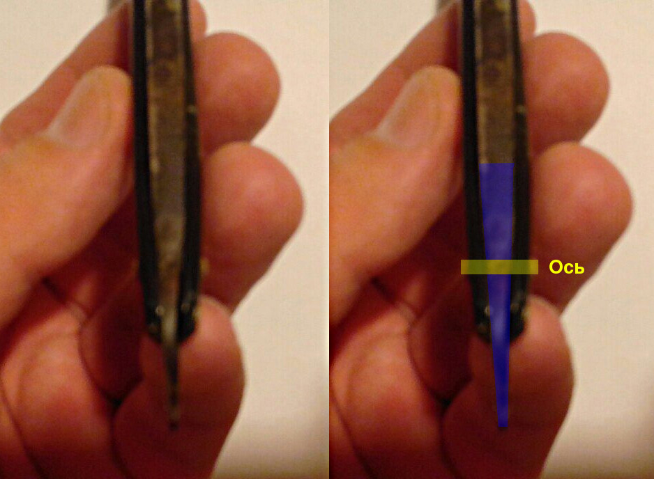 Итак, старый англичанин. Если смотреть сверху на обух, то у бритвы вся задняя часть (хвостовик + часть эрла) имеют клиновидный профиль. И в месте, где в бритве проходит ось, ее стороны вообще не параллельны - у нее там клин с нефиговым таким градусом. Половинки рукоятки (по-видимому целлулоид) довольно эластичные и немного изогнуты, как лук. Когда бритва открывается, то этот клин раздвигает с натягом самые кончики рукоятки (за осью) и тем самым ими же фиксируется очень плотно. В то же время середины рукояток сдвигаются, и уже получается, как будто этот лук выгнули в обратную сторону. Но когда бритва закрывается, то эта ее клиновидная часть ничего не раздвигает (рукоятка без всякого давленя огибает клинок), все это жутко люфтит и при закрытии режущая кромка почти всегда сталкивается с рукояткой. Я вертел в руках все это дело и мне подумалось, что если добавить третий пин, миллиметров 25 от оси (лишь бы хвост проходил), то он прижмет половинки рукоятки так, что и при складывании клиновидный эрл (если можно так выразиться) будет входить с натягом. При этом клинок центруется между рукоятками и бритва складывается правильно. Мне даже показалось, что это, возможно, не оригинальная рукоятка, а у оригинальной и было три пина. Но щас загуглил эти бритвы, гугл выдает фоток немного, но там везде два пина, как обычно. А может быть просто ось должна быть заклепана плотнее и тогда, учитывая, что рукоятка относительно гибкая, то она как-то с этим клиновидым профилем хвостовика будет нормально сосуществовать - сгибаться-разгибаться постоянно? Но мне кажется, что и в этом случае, и в моем гипотетическом варианте с дополнительным пином рукоятка будет постоянно терпеть лишние нагрузки. Или может быть нужно посадить на ось с хитрыми же клиновидными шайбами? Но это звучит чересчур сложно. В общем подскажите, как это должно быть правильно? Я новичок в этом деле и бритв вертел в руках всего-то пару. А это и не знаю по каким словам гуглить. Большинство бритв, как я понимаю, в месте оси плоские. Бритва - Taylor eye witness - The Favorite.