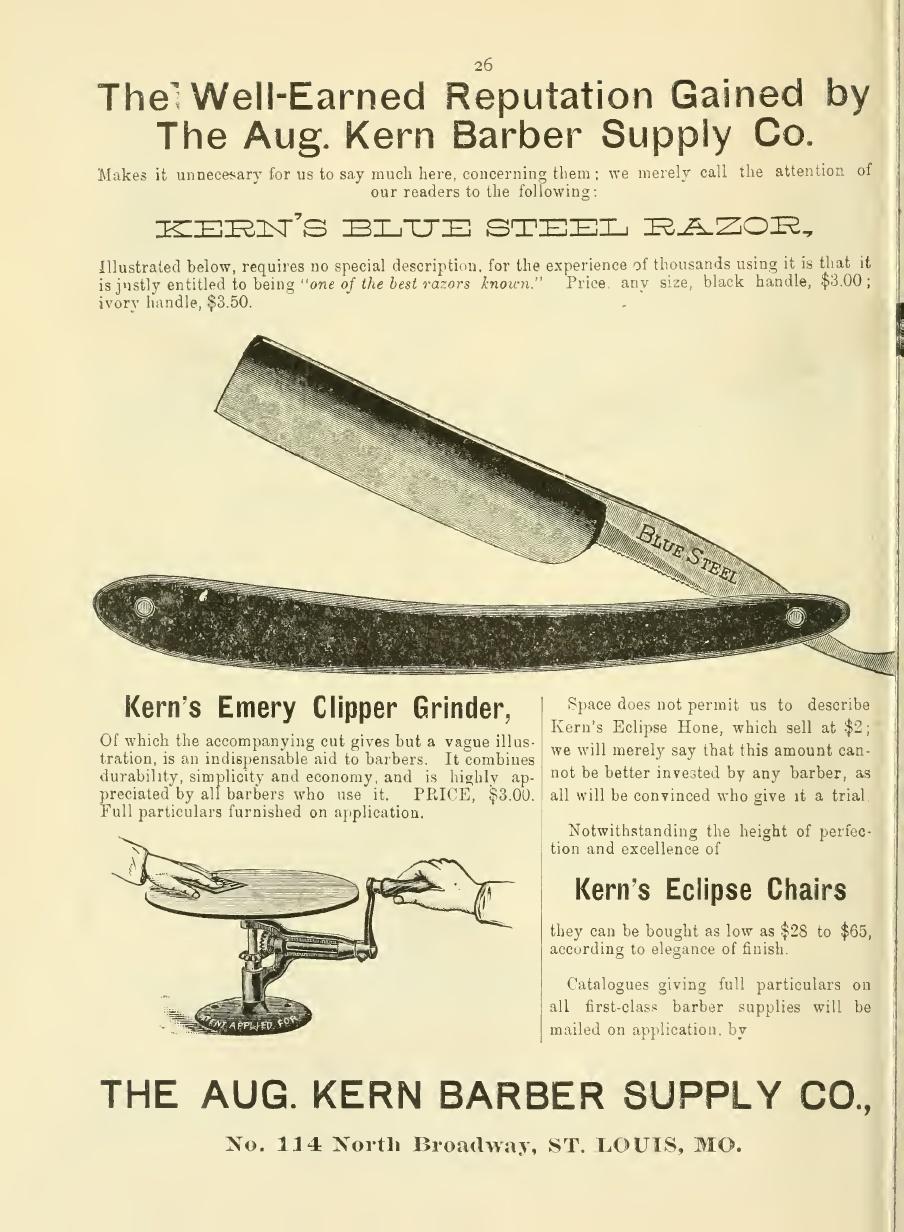 August Kern дистрибьютор из Сент-Лу́ис штат Миссури, США. Кроме бритв продавал различный инвентарь для парикмахерских: кресла, кружки для бритья, мебель, часы, рекламное оформление, парикмахерские флаконы, бутыли и их содержимое.