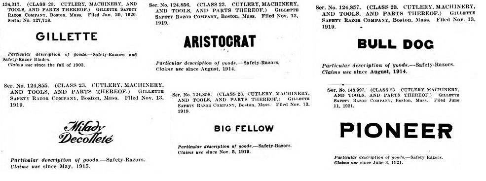 Пролистав Official gazette of the United States Patent Office, решил выписать от туда все фирмы, которые имеют отношение к бритвам (многие к безопасным бритвам) и скопировать их торговые марки.