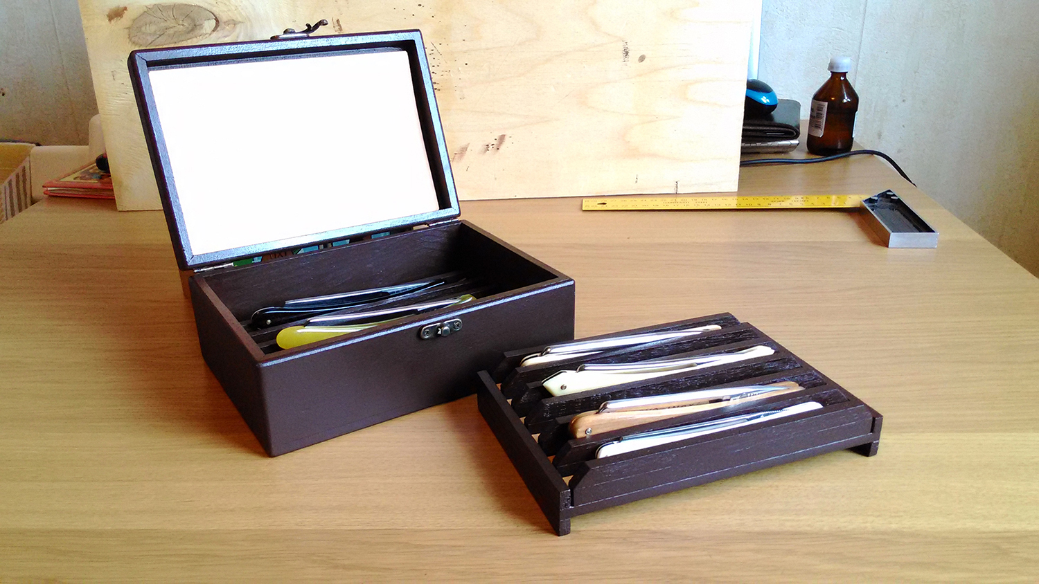 Изготовил давеча дом для бритв. Поделюсь информацией, возможно кому пригодится. В крупном сетевом магазине материалов для хобби купил уже готовую деревянную шкатулку, планки, фанерки, кусок кожи, акриловую краску. Потратил около 1800 рублей и три вечера на создание. Коробочка получилась вполне эргономичной и вместительной. В 2 ряда, один над другим, поместилось 13 бритв. Можно было вместить и 14, но верхний поддончик решил сделать с бортиками, чтобы исключить вероятность падения крайних бритв при вынимании, поэтому на нем разместились только 6 мест.