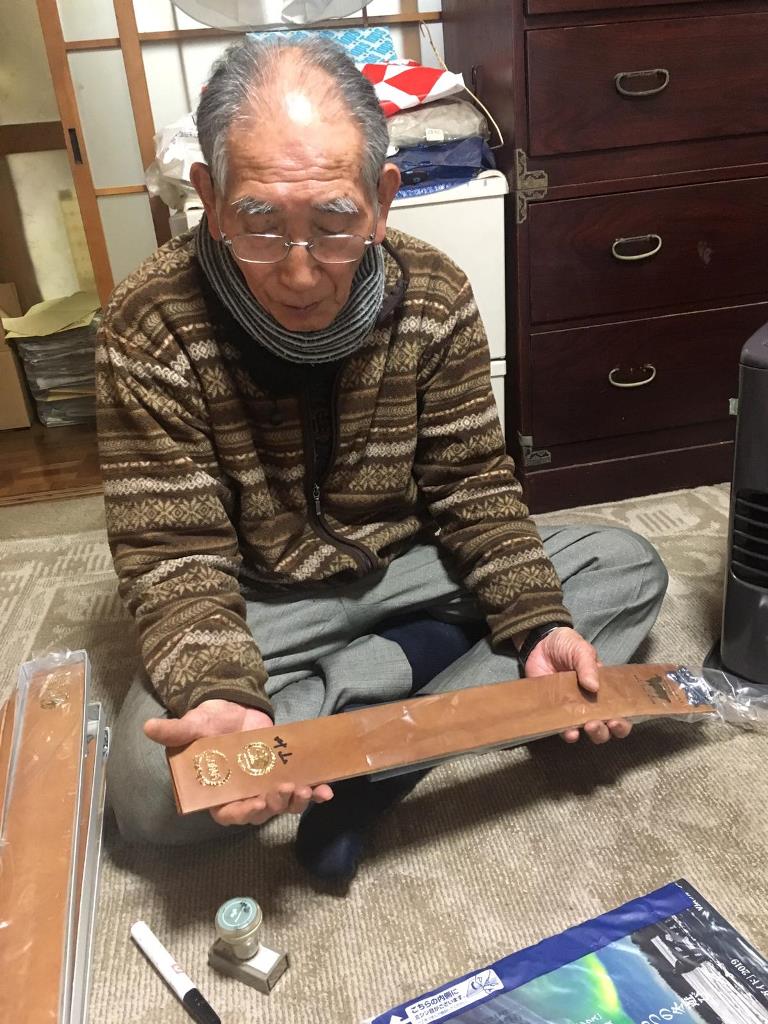 В конце, чтобы уж совсем у меня был "маузер Дзержинского" - я попросил Мастера подписать ремни, он ответил, мол есть лучше вариант - и принес и вручил свою визитную карточку. В Японии визитки вручают двумя руками и с поклоном, выглядит необычайно торжественно. Тут я совсем растерялся, тупанул и не сообразил достать свою визитку, чтобы уж совсем всё по-взрослому было. Хорошо жена не подвела и небольшой сувенир из Москвы мы не забыли подарить))) Ну и фото на память сделали