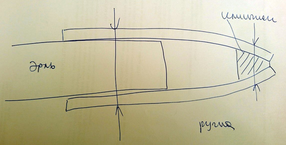 Я оставляю "пенек" под заклепку высотой в треть диаметра заклепки. То есть если например заклепка диаметром 2 мм, то "пенек" с каждой стороны будет примерно 0,6-0,7 мм. Разумеется при условии что внешние шайбы хорошо подогнаны. И заклепку лучше не откусывать, а отрезать чтобы торец "пенька" был ровным. Добавлено спустя 2 минуты 16 секунд: Внутренние шайбы никак не влияют на напряжения в пластике, в отличие от наружных. Скорее наоборот, они добавляют мягкости хода и мастеру труднее сориентироваться когда надо остановиться при заклепывании. Добавлено спустя 20 минут 39 секунд: Набросал на скорую руку. Схематически и весьма приближенно. Вот ручка без шайбы. Клинышек в ручке обеспечивает плавный изгиб половинок, в результате чего в районе заклепки они плотно прилегают к эрлю (он чуть клиновидный). А вот ручка с внутренними шайбами. Кроме того что пространство 3 лишний грязесборник, в точках 1 давление на пластик выше (по сравнению с конструкцией без шайб больше рычаг), а в точках 2 ниже, что создает условия благодаря которым половинки ручки менее параллельны поверхности эрля. А сейчас представьте как меняется давление в разных точках при открывании/закрывании бритвы. Центровка клинка обеспечивается сдвиганием половинок рукояти относительно клинка, а шайбы этому препятствуют, потому что обратный рычаг меньше и надо их сдвинуть ("перекосить" заклепку) больше чем в случае без шайб. И нафига эти качели? Знаю, что многие форумчане ставят внутренние шайбы, с уважением отношусь к их работе, но мое имхо - или огромные шайбы закрывающие всю площадь эрля под половинками рукояти или вообще без них. Кстати ручки дово рассчитаны именно на установку без шайб.