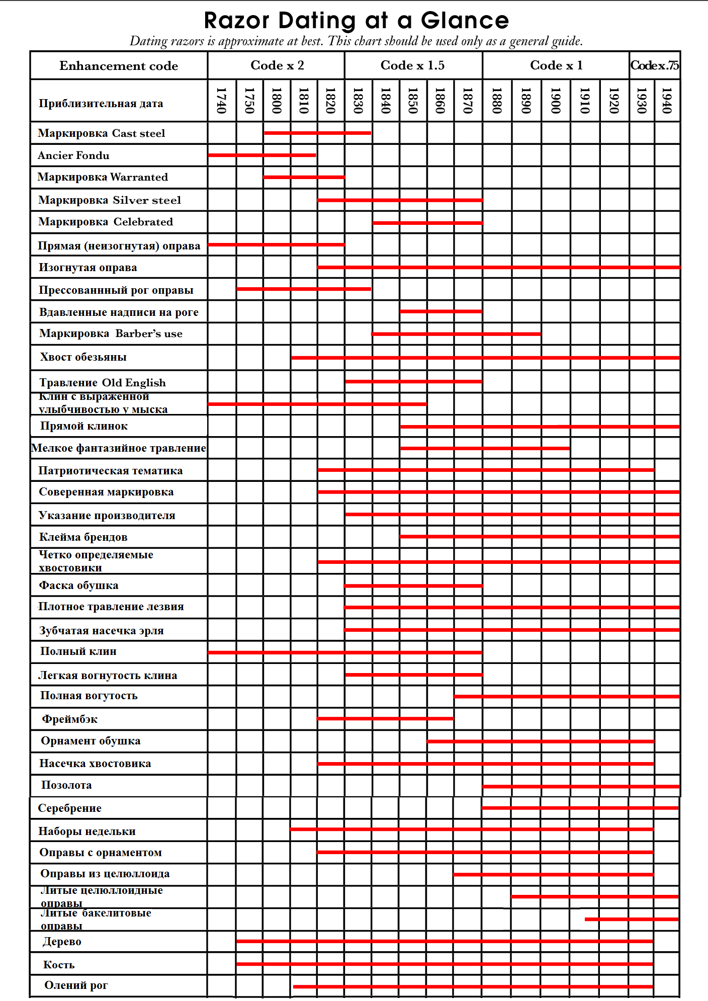 Таблица взята со стр.73 каталога Роя Ричи и Рона Стюарта STANDARD GUIDE TO RAZORS переиздания 2007 года.