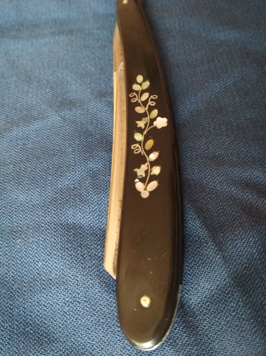 Привет всем. Добавлю в тему пару фоток. Попалась в руки такая бритва. Ручка кость, не пластмас. Рк длинна 80 мм. Ширина 15мм. Сохран средний. Интересная декорация на ручке.