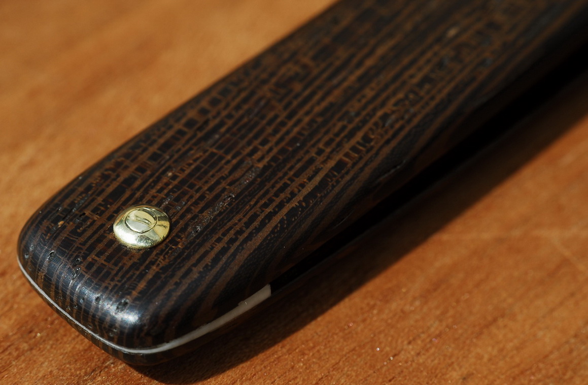 Re: Ручка (оправа) бритвы - изготовление/ремонтПриветствую, друзья! Попросил знакомый поменять ручку, на деревянную. Остановились на уже опробованном многими материале - венге (черное дерево). Использовал заготовку венге в радиальном разрезе, на мой взгляд в этом случае ручка выглядит строже и элегантней, что ли, даже на рог чем-то похоже:) Клинышек - слонкость.