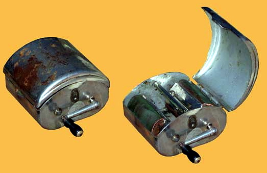 "Устройство для заточки лезвий - технический курьёз, малопонятный в наше время, когда лезвий уже в продаже нет, а бритвенные станки одноразовые. В те времена лезвия были тоже одноразовые, но их можно было затачивать. Советский прибор имел три поверхности для окончательной доводки лезвия, включая кожаную поверхность. Германский карманный прибор имел два вращающихся полуцилиндра, несущих полировальную пасту. Так же существовали карболитовые коробочки для лезвий, полировальные поверхности приводились в движение при помощи крепких шнуров, по которым ездила коробочка."