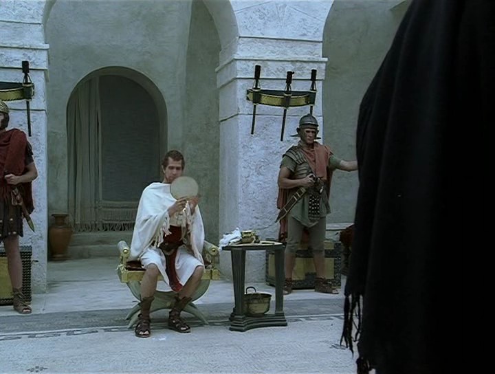 Re: Фильмы с участием опасной бритвы"Иисус. Бог и человек". Режиссер Роджер Янг, 1999 год. Бритье, а точнее- подбривание бородки Понтия Пилата (в исполнении Гарри Олдмена) римской бронзовой бритвой с использованием такого же зеркала.
