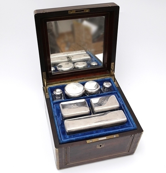 Дорожный туалетный набор в оригинальном деревянном футляре с зеркалом, инкрустированном латунью, с замком и монограммой "КА" в картуши. По информации из семьи наследниковов набор был подарен Константину Сергеевичу родителями. Имеет несколько ярусов. В верхнем расположены три стеклянные коробки с серебряными крышками (монограмма "КА"), два квадратных флакона также с серебряными крышками и монограммами, серебряный стаканчик, и две туалетные баночки (одна оригинальная стеклянная утрачена), в потайном отделении 2 расчески. Во втором ярусе находится 12 предметов: лезвие, большие и малые ножницы, складной перочинный ножик, ручка для пера, щипцы, надфиль, крючок, шило, карандаш выдвижной, ложечка. Нижний ярус - две щетки в футляре, большая щетка в футляре, помазок в коробочке, щетка для для усов, отделение для бритвы, ремня. Баночки и флаконы: серебро, литье, гравировка, стекло, гранение. Константи́н Серге́евич Станисла́вский (настоящая фамилия — Алексе́ев; 5 [17] января 1863, Москва — 7 августа 1938, Москва) — русский театральный режиссёр, актёр и педагог, реформатор театра. Создатель знаменитой актёрской системы, которая на протяжении 100 лет имеет огромную популярность в России и в мире. Первый Народный артист СССР (1936)[5]. В 1888 году стал одним из основателей Московского общества искусства и литературы. В 1898 году вместе с Вл. И. Немировичем-Данченко основал Московский Художественный театр. (Википедия) Волхвы не боятся могучих владык,
