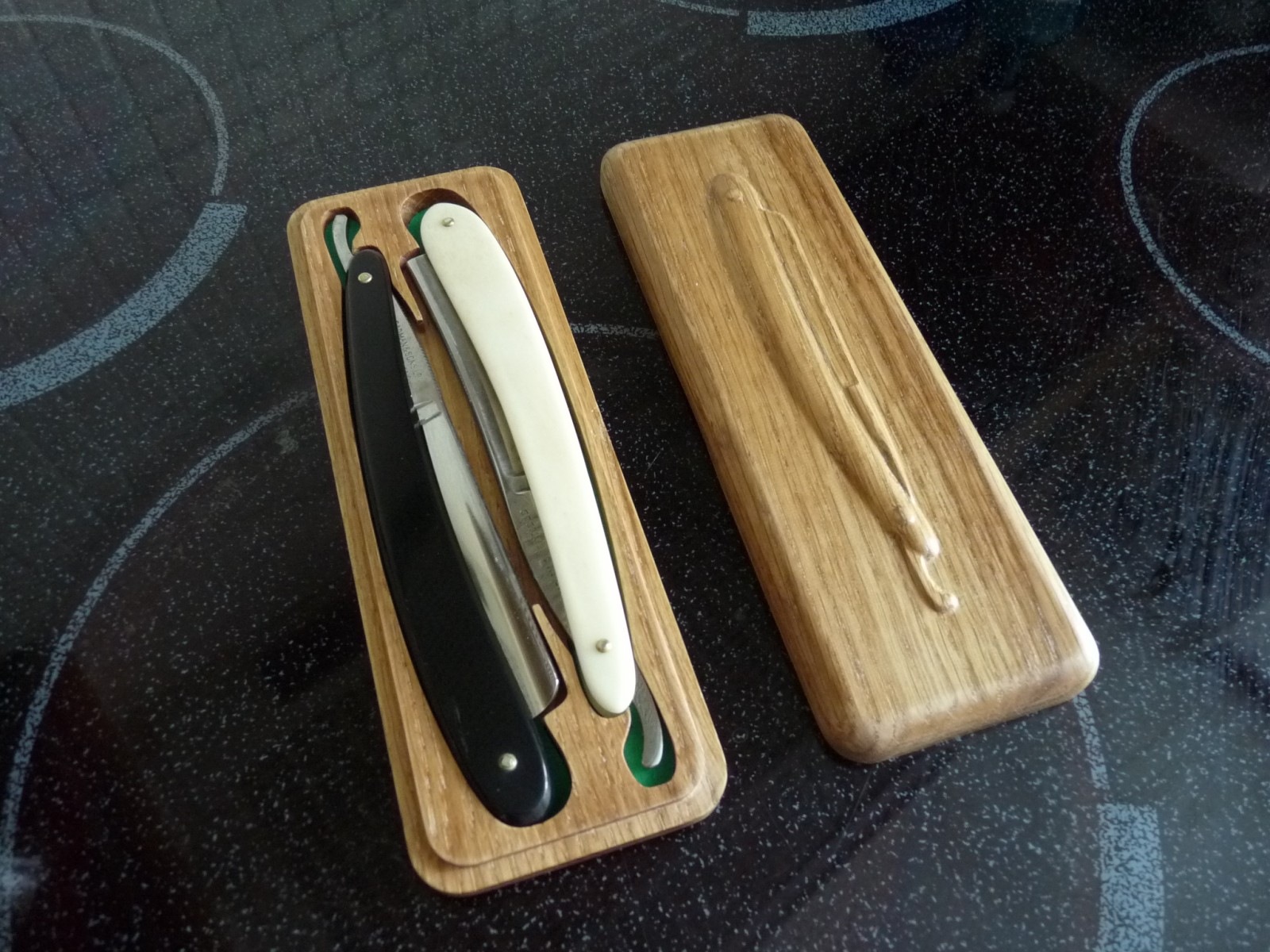 Re: Футляр для опасной бритвыПродолжая тему "командировочного" пенала на 2 бритвы, добавил для сравнения ещё 2 недоделанных пенала из дуба, а также: