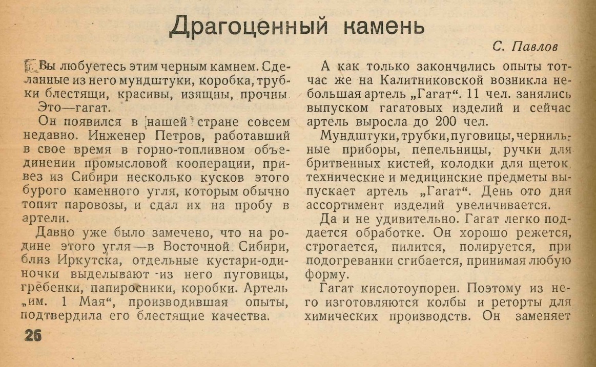 Пару месяцев назад заходил с женой в магазин типа "Самоцветы" и там обратил внимание на ихний гагат - кабошон такой черный полированный, глубокого черного цвета, и что меня поразило - очень лёгкий материал, я сразу подумал, что это пластик такой (по весу, по сравнению с ониксом, который там щупал). На вопрос "что это", сказали, что естественный материал (не искусственный), разновидность угля типа, но да, идет на поделки околоювелирные, цену не помню, не особо поразила.