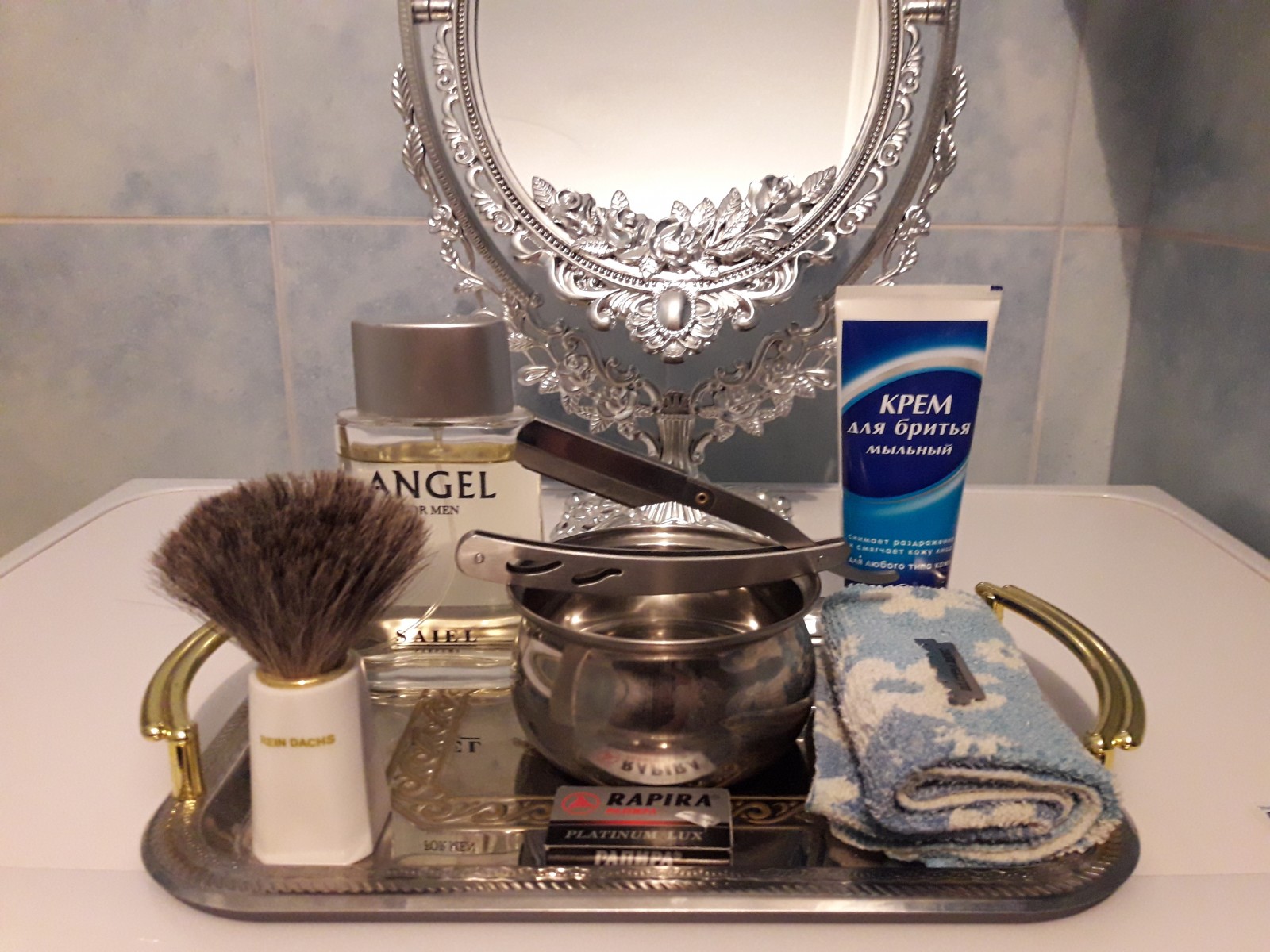 Re: Наше бритьёСегодняшнее бритьё. Бритва - Англия, Помазок - Китай по ощущениям сделан с колючей проволоки времён юности великого кормчего, " Крем - "Мыльный " превосходен, Полотенце для Души.