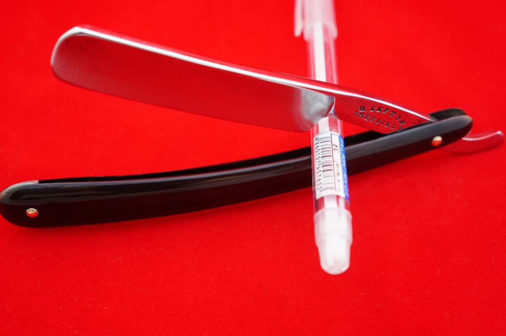 Англия, выборка лезвия Near Vedge (почти клин), углеродка, ширина лезвия в самом широком месте - 19 мм., ширина обуха - 5,5 мм., длина лезвия - 76 мм., ручка - родная, рог, слегка поведена в нижней четверти ( заметно при пристальном внимании, на закрытие-открытие не влияет), пины, шайбы новые - латунь. Возраст - ориентировочно конец 19 - начало 20 в.в. Заточена, готова к работе. Бреет очень мягко, как и большинство клинов. Состояние в целом - почти идеальное, бреет отлично. Продано (на другом ресурсе) H. Sefton Show
