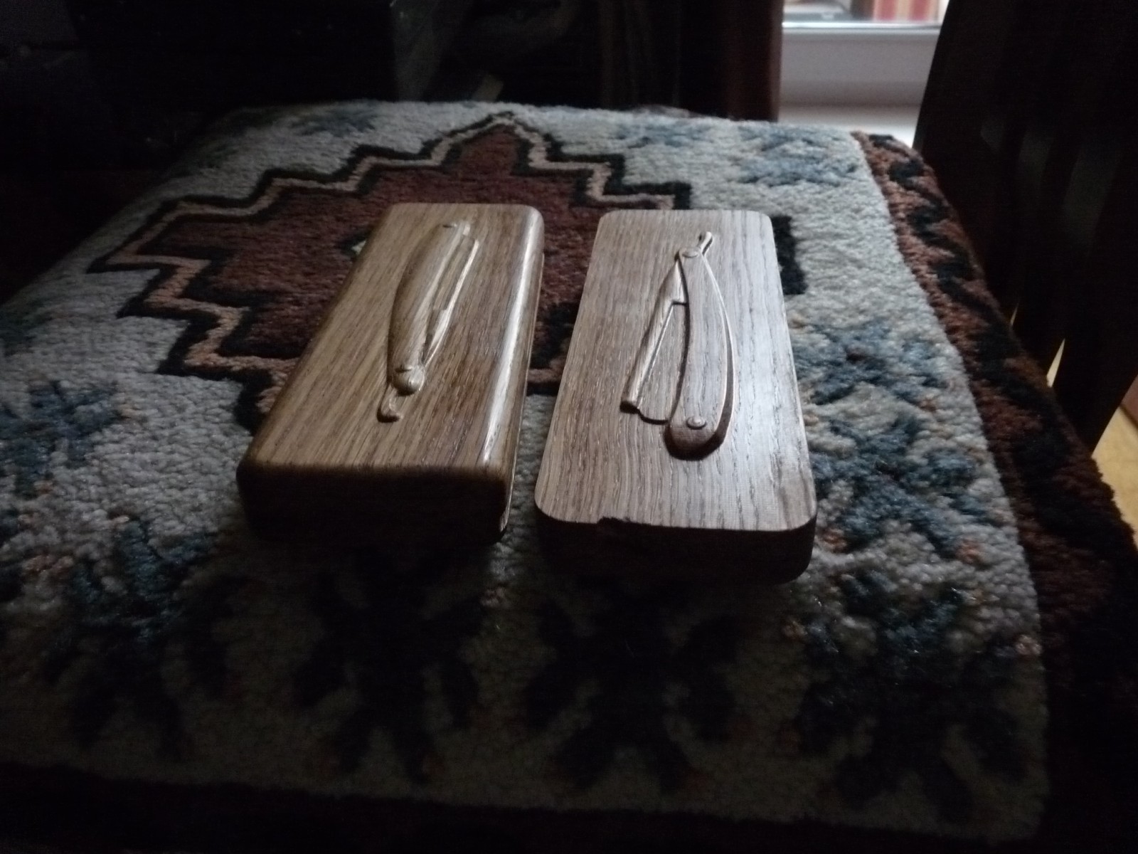 Re: Футляр для опасной бритвыПродолжая тему "командировочного" пенала на 2 бритвы, добавил для сравнения ещё 2 недоделанных пенала из дуба, а также: