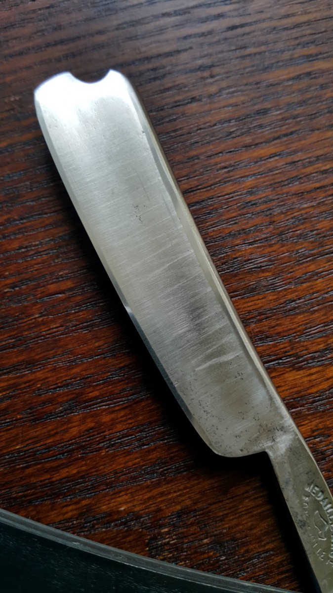 Re: Продаётся от S&T21. Нечастый гость - G.Johnson, под восстановление. Бритва из эпохи становления hollow ground. Ширина 20мм, длина рабочей кромки 65мм, обух около 6мм. Есть каверны, сточенность минимальная, в районе рабочей кромки коррозии и повреждений нет. Клинок производит впечатление слегка укороченной/дорожной версии, по крайней мере на фоне ручки, которая стандартного размера 145мм. Ручка из рога, в очень хорошем состоянии, без трещин, ровная. Клинышек из олова.