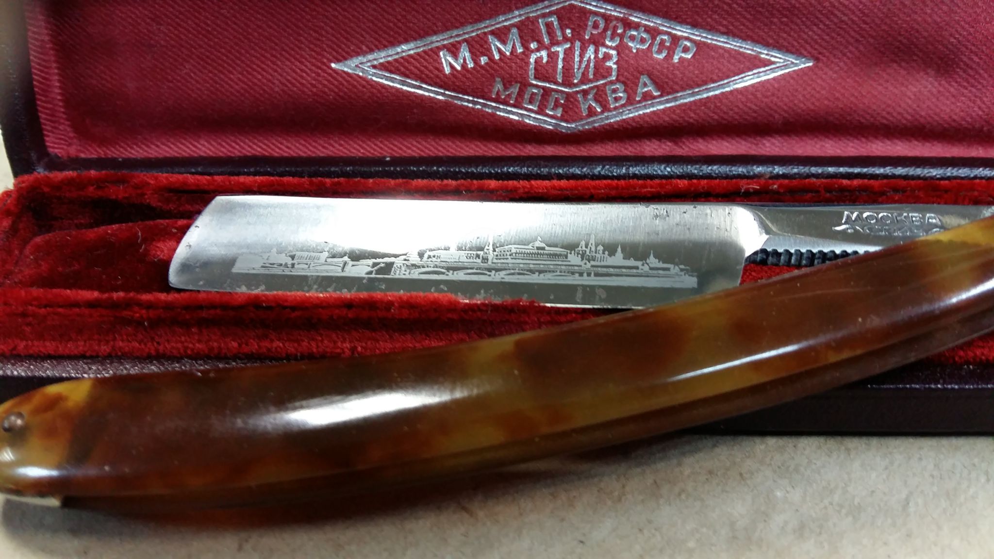 Бритва "Москва" с гравировкой на полотне появилась в 1946 или 1947 году. На фото видно и нестандартный ромб и принадлежность к ММП и отсутствие года на клейме бритвы.