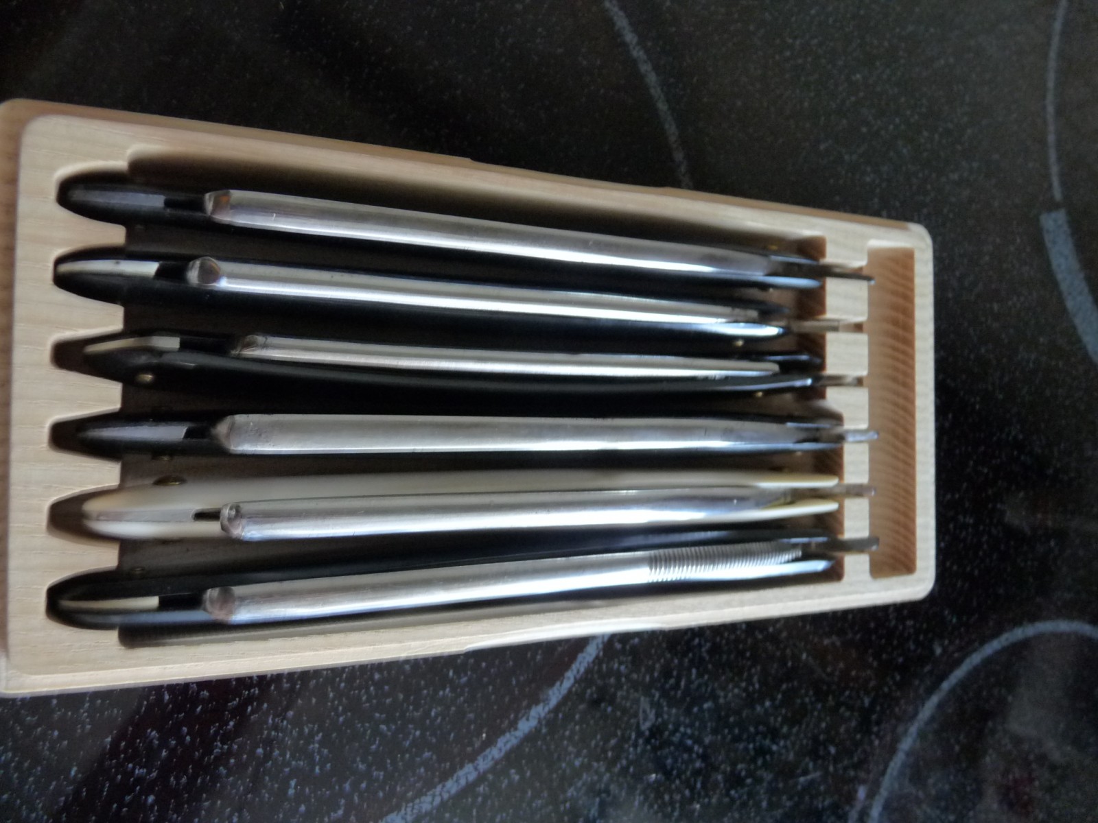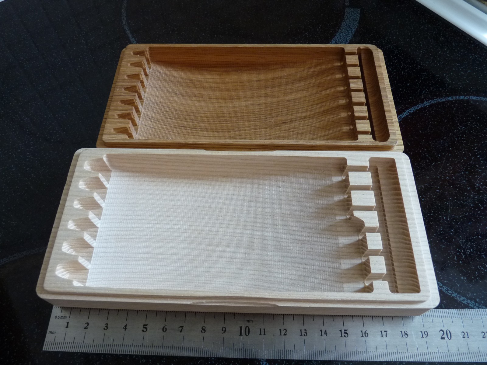 Кофрик на 6 бритв, 3 побольше (ручка - 145мм) + 3 поменьше (ручка - 140мм). Дерево - ясень. Высота рельефа бритовки - 2,538мм по нижнему пину. Примерил бритовки, спецом взял 5 черных и 1 белую, ибо фетр взял черный (гурманю тут вишь ли Кофрик вышел чуть уже и чуть длиннее дубовой "недельки", что была выложена выше, зато вырезы под хвосты для нижних пинов были увеличены для того чтобы могли влезать кроме утончённых слоновых хвостов англов и советских в расцвете бритв. Да и длина под ручки тоже немного больше. Но всё же это 5/8 и 6/8, однако 4/8 там утонут - не пойдут. Предотпускной каприз эдакий. Золотое сечение... PS фетр просто вставлен, не закреплён, ибо ещё не доработано. последнее фото - те самые вырезы (ещё не ошкурено) - видна ступенька - верх обработан конической фрезой, книзу - обычная сферическая цилиндрическая. И разные размеры вырезов - с краёв побольше, к центру поменьше - симметрия... И виден рельеф дна короба - тоже рельефная выборка, повторяющая изгиб ручки бритвы. Кстати рельеф дна, как и рельеф крышки изнутри можно сделать тоже волнистым - бритва как бы лежит на дне волны и волной (крышки) прикрывается Ну понятно, что волна крышки будучи прикрыта фетром будет выглядеть как волна фетра... (волна вдоль ручки бритв - 6 бритв = 5 волн + 2 полуволны, объединённые со стенками), для удобства фиксации бритв в закрытом положении коробки, ну и для красоты для (или это излишне?). PSS Кстати,футлярчик из сушёного ясеня с шестью моими бритвами и фетром весит 501грамм, без бритв = 230грамм. При этом это вес до обработки маслом.