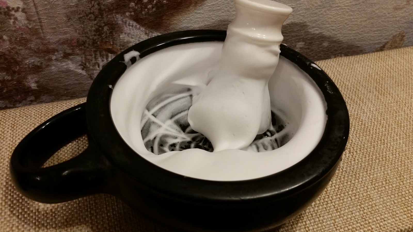 Кружка для бритьяС нормальным помазком и нормальным мылом скаттл вообще не нужен, по идее. И на морде отлично взбить пену можно, а хороший помазок, даже совсем маленький, пены удерживает на 2 захода минимум.