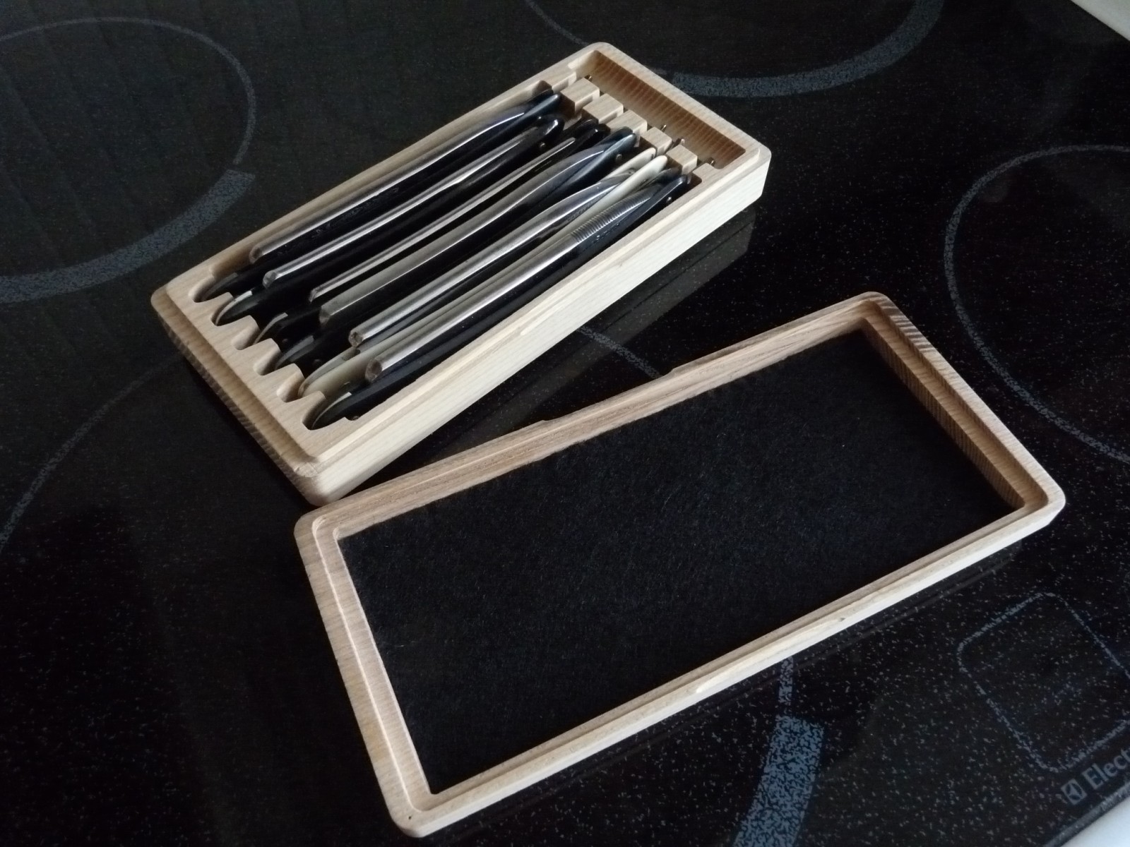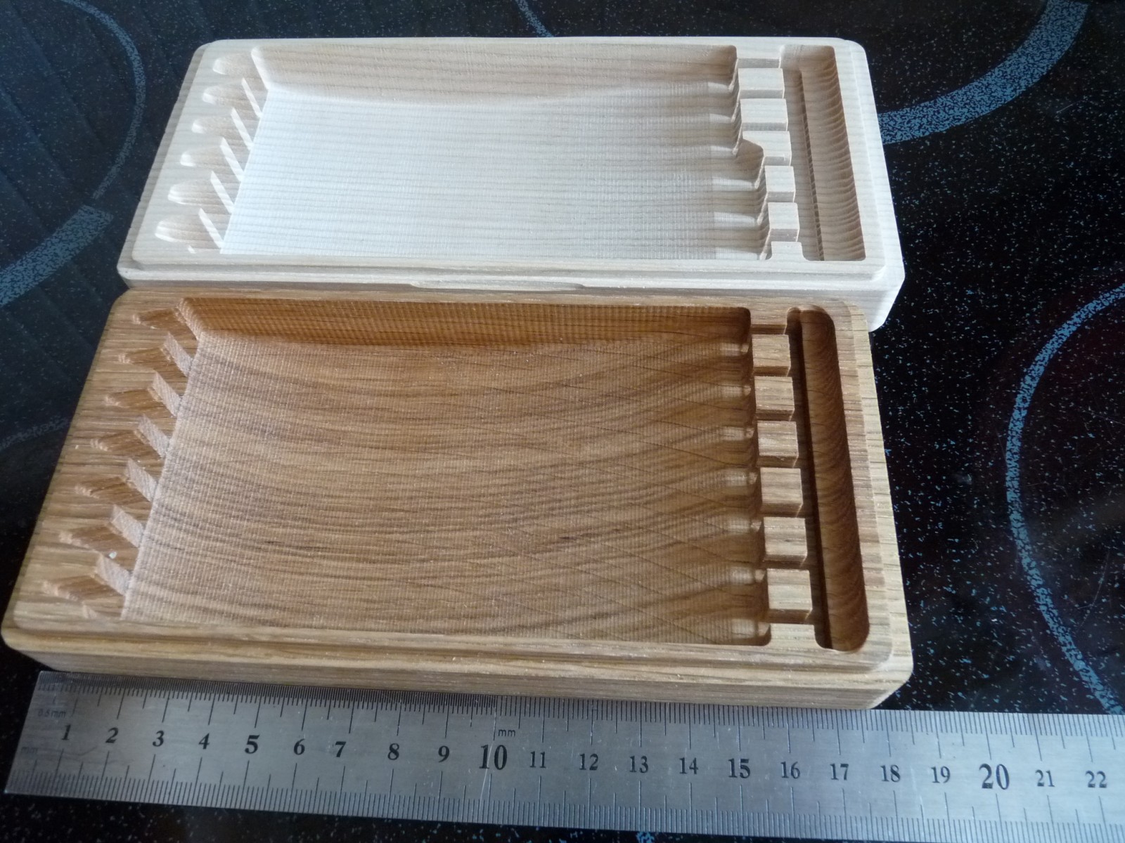 Кофрик на 6 бритв, 3 побольше (ручка - 145мм) + 3 поменьше (ручка - 140мм). Дерево - ясень. Высота рельефа бритовки - 2,538мм по нижнему пину. Примерил бритовки, спецом взял 5 черных и 1 белую, ибо фетр взял черный (гурманю тут вишь ли Кофрик вышел чуть уже и чуть длиннее дубовой "недельки", что была выложена выше, зато вырезы под хвосты для нижних пинов были увеличены для того чтобы могли влезать кроме утончённых слоновых хвостов англов и советских в расцвете бритв. Да и длина под ручки тоже немного больше. Но всё же это 5/8 и 6/8, однако 4/8 там утонут - не пойдут. Предотпускной каприз эдакий. Золотое сечение... PS фетр просто вставлен, не закреплён, ибо ещё не доработано. последнее фото - те самые вырезы (ещё не ошкурено) - видна ступенька - верх обработан конической фрезой, книзу - обычная сферическая цилиндрическая. И разные размеры вырезов - с краёв побольше, к центру поменьше - симметрия... И виден рельеф дна короба - тоже рельефная выборка, повторяющая изгиб ручки бритвы. Кстати рельеф дна, как и рельеф крышки изнутри можно сделать тоже волнистым - бритва как бы лежит на дне волны и волной (крышки) прикрывается Ну понятно, что волна крышки будучи прикрыта фетром будет выглядеть как волна фетра... (волна вдоль ручки бритв - 6 бритв = 5 волн + 2 полуволны, объединённые со стенками), для удобства фиксации бритв в закрытом положении коробки, ну и для красоты для (или это излишне?). PSS Кстати,футлярчик из сушёного ясеня с шестью моими бритвами и фетром весит 501грамм, без бритв = 230грамм. При этом это вес до обработки маслом.