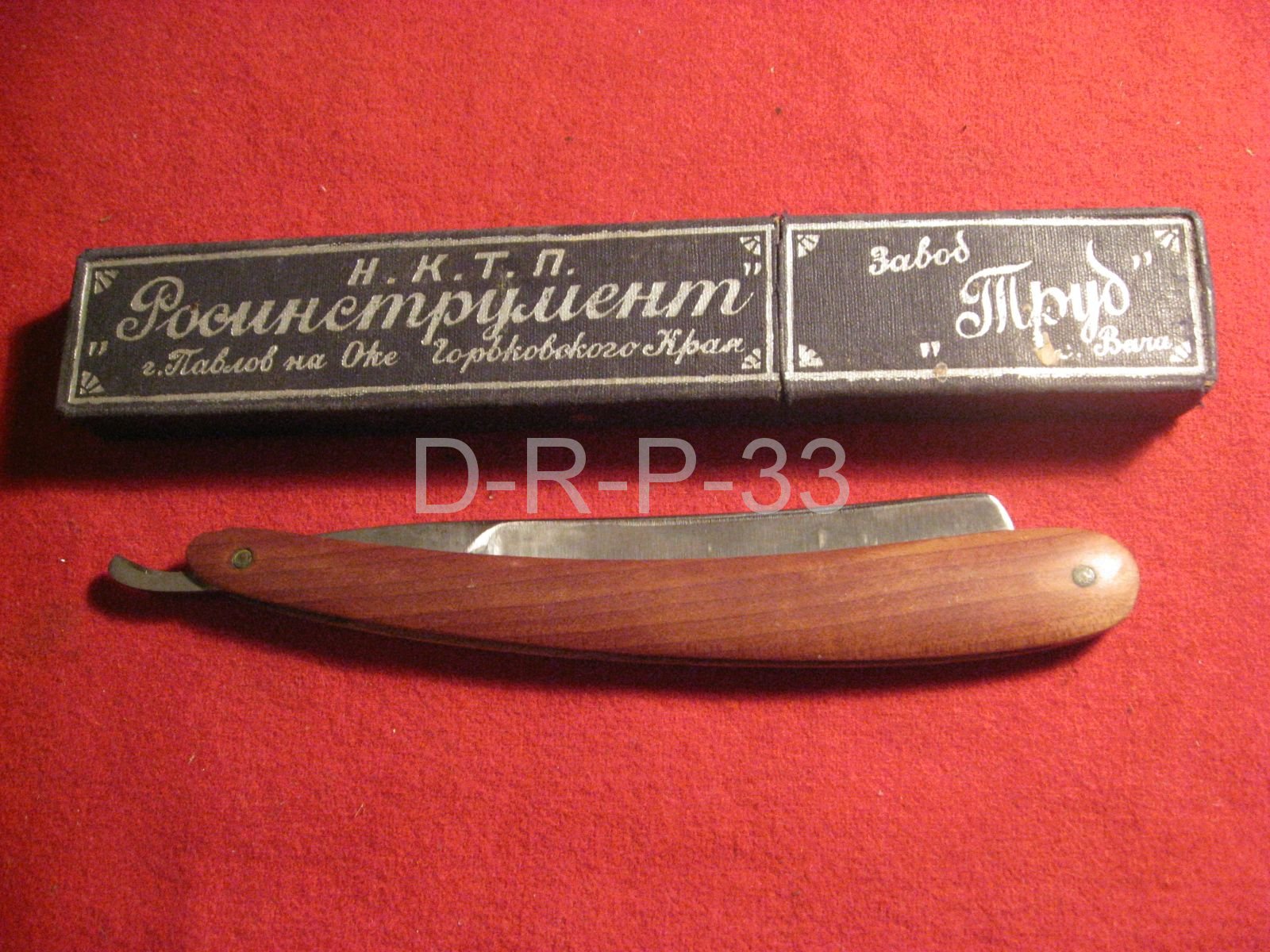 Вторая бритва в знакомой коробке г.Павлов на Оке, Горьковского края. Бритва вероятно номер 1102 из того же альбома. Незнаком для меня материал ручки. Чёрный, достаточно твёрдый материал, не уверен, что карболит.