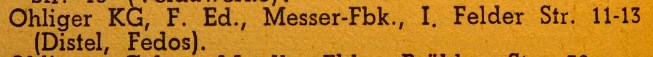 Из французского патентного журнала, 1929 год: F. ED. OHLIGER, производство, покупка и продажа Торговая марка DISTEL зарегистрирована в Германии 3 сентября 1898 года и 17 апреля 1928 года Столовые ножи, ножи для хлеба, мяса, кухонные, овощерезки, бритвы, ножи, карманные ножи, ножницы всех видов, инструменты для столяров, плотников, кузнецов, бондарей, сапожников, жестянщиков. Из DMA 1937 года: Messer-fabrik (ножевая фабрика) улица I. Felder, 11-13, Solingen торговые марки: DISTEL FEDOS Re: F. ED. OHLIGER GARANTIE SOLINGENа что это значит? зачем ее дважды регистрировать? Броня крепка и танки наши быстры!