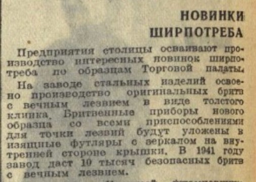 С июля 1935 года ручки для бритв артели начали делать на фабрике №4 треста Моспластмасс. (Новый вид изделий)