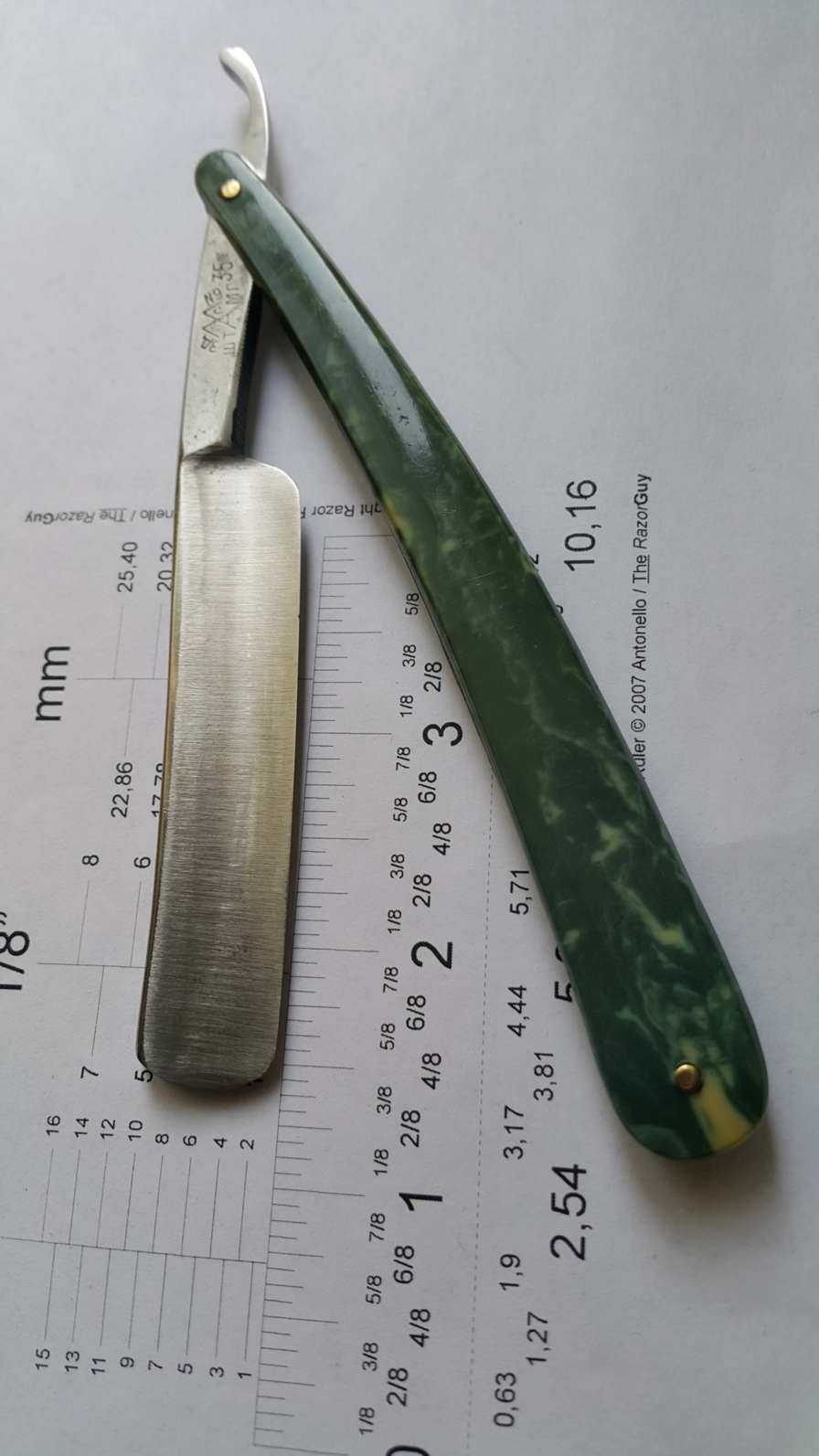 Re: Продаётся от S&T25. Предложение для коллекционеров: довоенная бритва завода Мосштамп, 1935 год, в родном футляре. Вроде как все родное. Выборка 1/2, гринд грубоватый, ширина 16 мм, обух 4,5мм. Ручка - пластик. При вхождении клинка в ручку чуть закусывает на самом дальнем конце. Оригинальное состояние, бритва не разбиралась, не шкурилась и пр. Бритва не заточена.