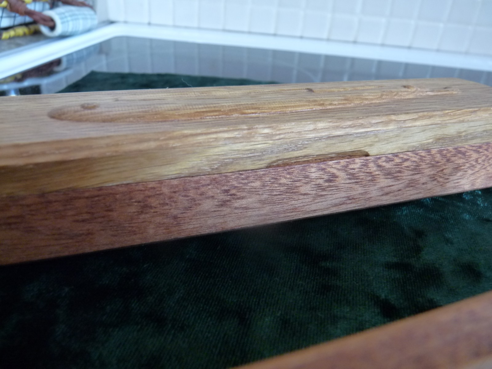 Здесь уже итоговый мой (к которому я пришёл после проб и ошибок) - "типовой" вариант футлярчика (габариты/кроме высоты/, форма, наполнение) с небольшими вариациями типа рельефов и надписей. Для бритв малых и средних размеров, до 6/8 где-то (со вкладышами или без). Но, если делать без вкладыша, может зайти практически любая бритва для бритья - внутренний габарит 30х166мм. Всякие Монстры и Кастомы нуждаются в индивидуальном подходе. Именно этот вариант из красного дерева получился самым сбалансированным с моей точки зрения, как по расцветке дерева, компоновке/сочетании линий дерева на крышке и корпусе, так и по точности исполнения, центровкам... в общем некий мой пик. Рельеф бритвы делал фрезой d2мм, а рельеф букв на дне (они выпуклые и "утоплены" в овальной выемке на 2мм от поверхности дна) - гравером d0.5мм. По сравнению с "дубовой" версией футляра весь рельеф бритвы ещё приподнял над уровнем "пола" на 0,5мм, так как футляр получился повыше (на пине максимум - 3,15мм), и так смотрится лучше, IMHO. Для сравнения даю фотки с аналогом из дуба ( сделанного для другого человека). И фотки, где короба показываю с заменой крышек этих двух футляров друг у друга - абсолютная взаимозаменяемость. Как всегда, вставляемые сменные вкладыши (подкладку тоже можно менять) под разные бритвы.